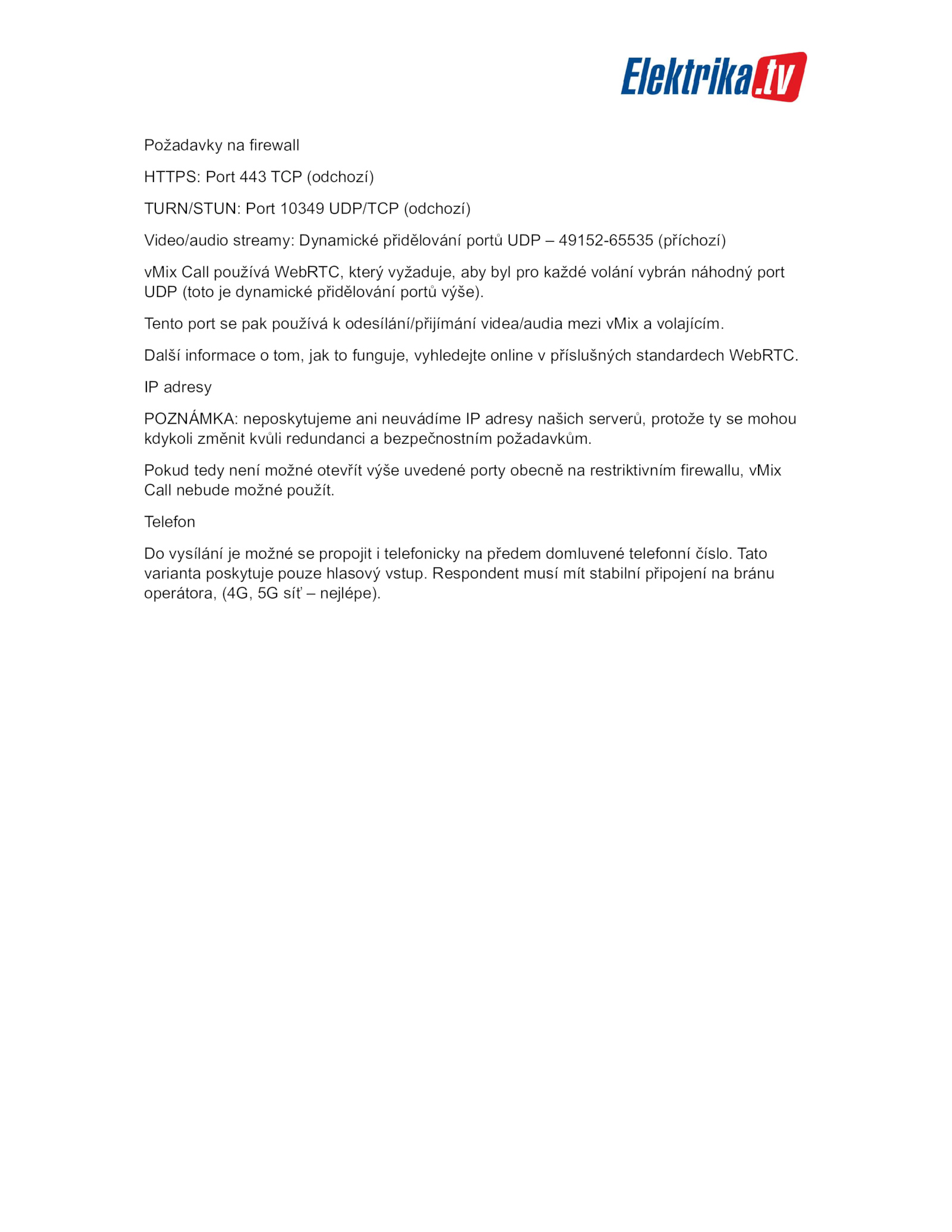vMix Call používá WebRTC, který vyžaduje, aby byl pro každé volání vybrán náhodný port