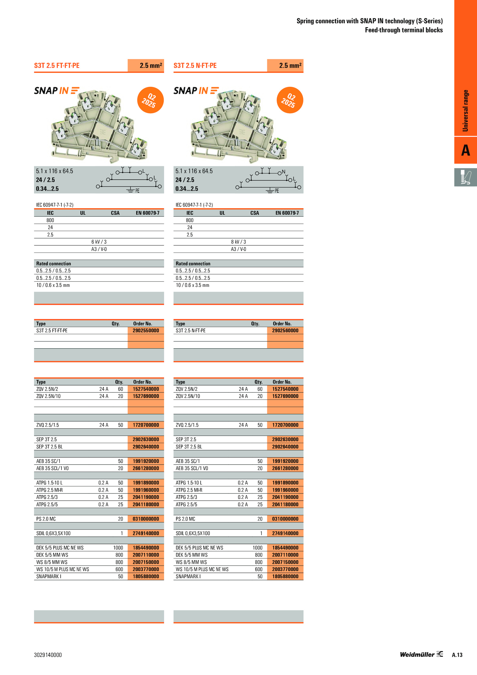 5.5.5/3 0.2. ZQV 2.5 0..5 mm Type Qty.6 3.2.5 10 0.13 3029140000 S3T 2.34.5 0.6 3.2.5 0.2...5.5/5 0.5...5 0..5.5 mm Type Qty.2 2041180000 PS 2..5 0.5 0.5 mm² 5.1 116 64.5N/2 1527540000 ZQV 2.5 MI-R 0.5 L L IEC CSA 60079-7 800 24 2.5 N L IEC CSA 60079-7 800 24 2..A Universal range A.5N/10 1527690000 ZVQ 2.5 24 2.5 1720700000 SEP 2.5/1.2..5 24 2.5 2902630000 SEP 2..34. S3T 2.2 2041190000 ATPG 2.5 8 3 A3 V-0 Rated connection 0.5 FT-FT-PE 2902550000 Type Qty.2.5/5 0.5N/2 1527540000 ZQV 2.2 1991960000 ATPG 2.2..2 1991960000 ATPG 2..5/3 0.0 0310000000 SDIL 0,6X3,5X100 2749140000 DEK 5/5 PLUS 1000 1854490000 DEK 5/5 800 2007110000 WS 8/5 800 2007150000 WS 10/5 PLUS 600 2003770000 SNAPMARK 1805880000 IEC 60947-7-1 (-7-2) 4 S3T 2.5 2902640000 AEB SC/1 1991920000 AEB SCL/1 2661280000 ATPG 1..2 2041190000 ATPG 2. Order No.5 1720700000 SEP 2.. Order No..2 1991890000 ATPG 2.5 FT-FT-PE 2.5 2902640000 AEB SC/1 1991920000 AEB SCL/1 2661280000 ATPG 1.5 2902630000 SEP 2.2..2.5.5 N-FT-PE 2.5 mm² 5.5.2 2041180000 PS 2.5 N-FT-PE 2902560000 Type Qty.2.5 0.5.5-10 0. Order No. ZQV 2.5 MI-R 0.. Order No...1 116 64.5N/10 1527690000 ZVQ 2..0 0310000000 SDIL 0,6X3,5X100 2749140000 DEK 5/5 PLUS 1000 1854490000 DEK 5/5 800 2007110000 WS 8/5 800 2007150000 WS 10/5 PLUS 600 2003770000 SNAPMARK 1805880000 IEC 60947-7-1 (-7-2) 4 Spring connection with SNAP technology (S-Series) Feed-through terminal blocks .5 10 0.5 6 3 A3 V-0 Rated connection 0.5/1.5-10 0.2 1991890000 ATPG 2. S3T 2.5 0