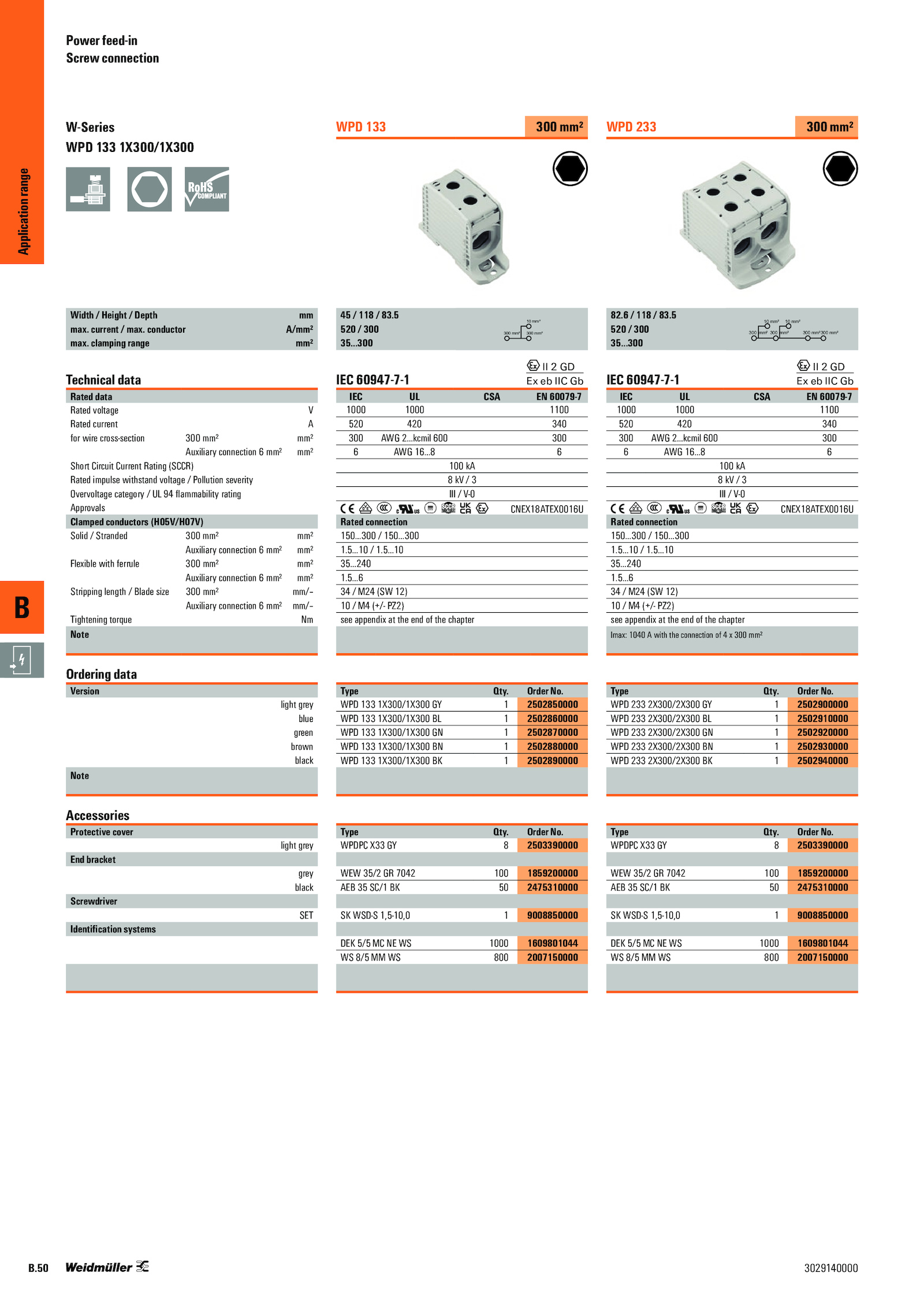 Order No.6 118 83. WPDPC X33 2503390000 WEW 35/2 7042 100 1859200000 AEB SC/1 2475310000 SK WSD-S 1,5-10,0 9008850000 DEK 5/5 1000 1609801044 WS 8/5 800 2007150000 WPD 233 300 mm² 82.5 300 mm² 300 mm² 10 mm² 520 300 35…300 IEC 60947-7-1 II GD Ex IIC Gb IEC CSA 60079-7 1000 1000 1100 520 420 340 300 AWG 2…kcmil 600 300 6 AWG 16…8 6 100 kA 8 3 III V-0 CNEX18ATEX0016U Rated connection 150…300 150…300 1.5…10 35…240 1.5…10 35…240 1. Order No. current max.5 300 mm² 300 mm² 10 mm² 300 mm²300 mm² 10 mm² 520 300 35…300 IEC 60947-7-1 II GD Ex IIC Gb IEC CSA 60079-7 1000 1000 1100 520 420 340 300 AWG 2…kcmil 600 300 6 AWG 16…8 6 100 kA 8 3 III V-0 CNEX18ATEX0016U Rated connection 150…300 150…300 1. WPD 133 1X300/1X300 2502850000 WPD 133 1X300/1X300 2502860000 WPD 133 1X300/1X300 2502870000 WPD 133 1X300/1X300 2502880000 WPD 133 1X300/1X300 2502890000 Type Qty.50 3029140000 Application range B . Order No. clamping range mm² Technical data Rated data Rated voltage V Rated current A for wire cross-section 300 mm² mm² Auxiliary connection mm² mm² Short Circuit Current Rating (SCCR) Rated impulse withstand voltage Pollution severity Overvoltage category flammability rating Approvals Clamped conductors (H05V/H07V) Solid Stranded 300 mm² mm² Auxiliary connection mm² mm² Flexible with ferrule 300 mm² mm² Auxiliary connection mm² mm² Stripping length Blade size 300 mm² mm/– Auxiliary connection mm² mm/– Tightening torque Nm Note Ordering data Version light grey blue green brown black Note Accessories Protective cover light grey End bracket grey black Screwdriver SET Identification systems WPD 133 300 mm² 45 118 83. WPD 233 2X300/2X300 2502900000 WPD 233 2X300/2X300 2502910000 WPD 233 2X300/2X300 2502920000 WPD 233 2X300/2X300 2502930000 WPD 233 2X300/2X300 2502940000 Type Qty.5…10 1.W-Series WPD 133 1X300/1X300 Width Height Depth mm max. WPDPC X33 2503390000 WEW 35/2 7042 100 1859200000 AEB SC/1 2475310000 SK WSD-S 1,5-10,0 9008850000 DEK 5/5 1000 1609801044 WS 8/5 800 2007150000 Power feed-in Screw connection B. conductor A/mm² max.5…10 1.5…6 34 M24 (SW 12) 10 (+/- PZ2) see appendix the end the chapter Type Qty.5…6 34 M24 (SW 12) 10 (+/- PZ2) see appendix the end the chapter Imax: 1040 with the connection 300 mm² Type Qty. Order No
