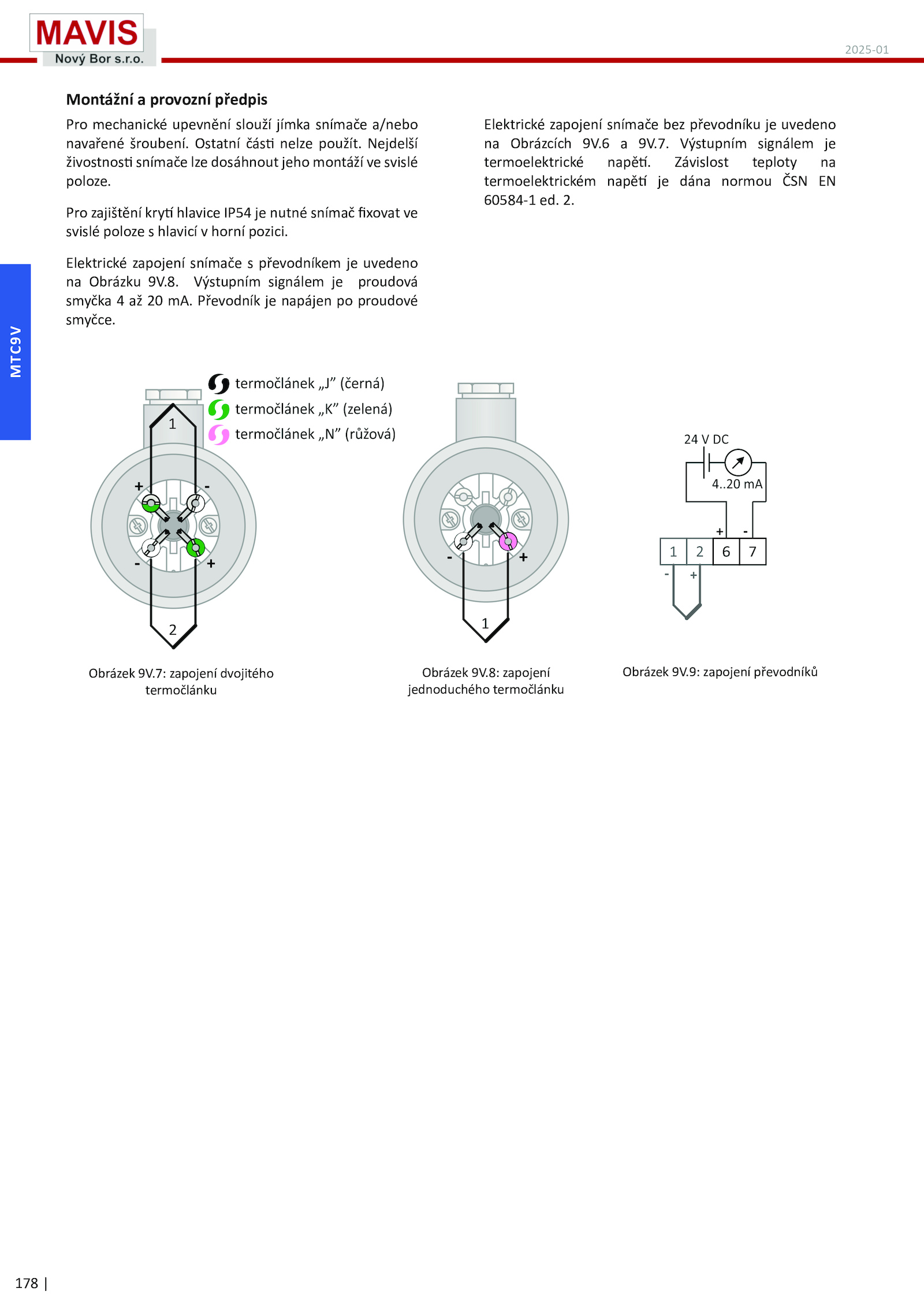 7: zapojení dvojitého termočlánku Obrázek 9V. Výstupním signálem je termoelektrické napě�.8.7. Nejdelší živostnos� snímače lze dosáhnout jeho montáží svislé poloze. Výstupním signálem proudová smyčka mA. 2.8: zapojení jednoduchého termočlánku Obrázek 9V.9: zapojení převodníků . Závislost teploty na termoelektrickém napě� dána normou ČSN EN 60584-1 ed. Převodník napájen proudové smyčce. Ostatní čás� nelze použít. Pro zajištění kry� hlavice IP54 nutné snímač fixovat ve svislé poloze hlavicí horní pozici. Elektrické zapojení snímače převodníkem uvedeno na Obrázku 9V.6 9V. Elektrické zapojení snímače bez převodníku uvedeno na Obrázcích 9V. Obrázek 9V.178 | MTC9V Montážní provozní předpis Pro mechanické upevnění slouží jímka snímače a/nebo navařené šroubení