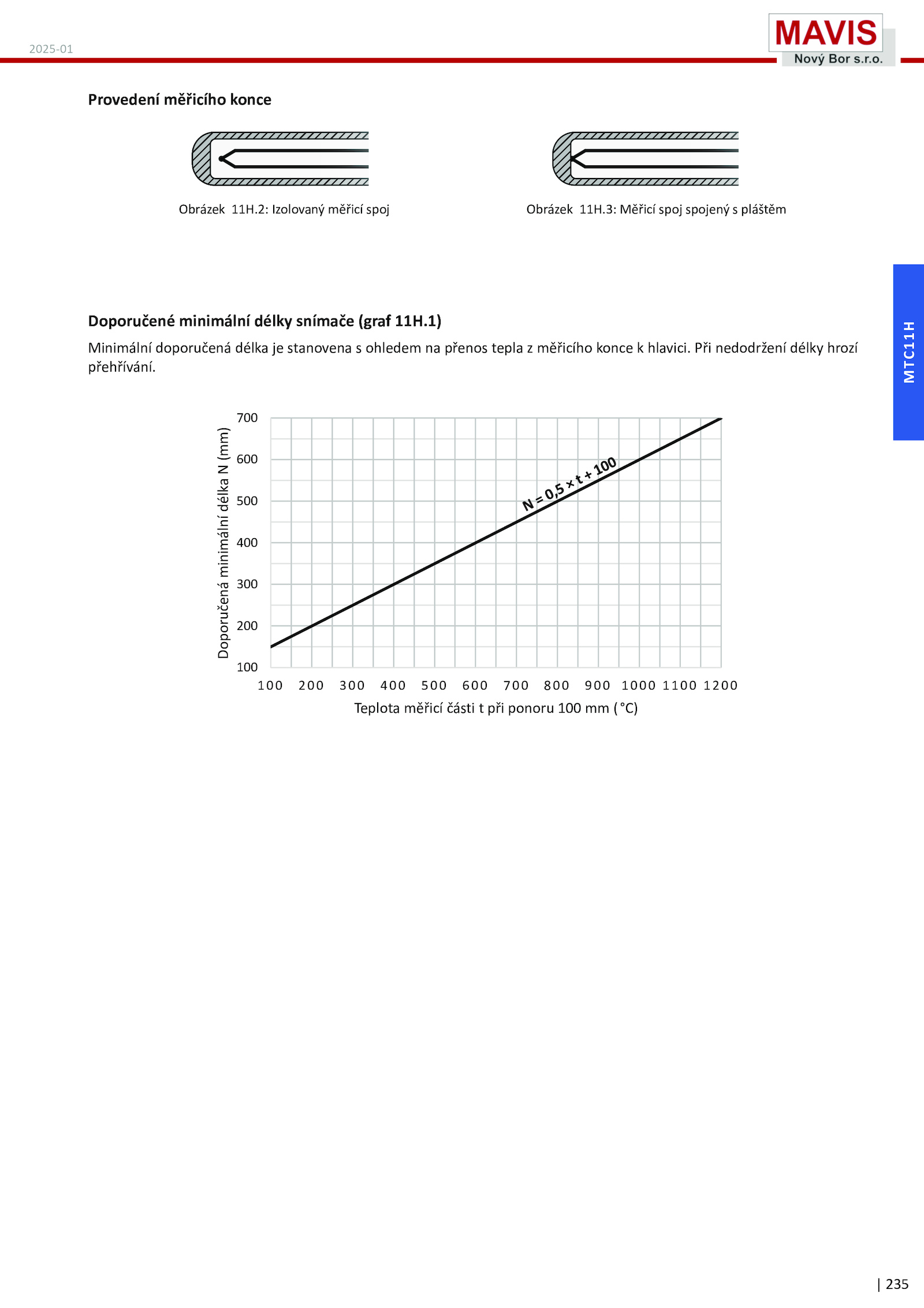 Při nedodržení délky hrozí přehřívání. 100 200 300 400 500 600 700 100 200 300 400 500 600 700 800 900 1000 1100 1200 Doporučená minimální délka N (mm) Teplota měřicí části při ponoru 100 (°C) .3: Měřicí spoj spojený pláštěm Minimální doporučená délka stanovena ohledem přenos tepla měřicího konce hlavici.2: Izolovaný měřicí spoj Obrázek 11H.235 MTC11H Doporučené minimální délky snímače (graf 11H.1) Provedení měřicího konce Obrázek 11H
