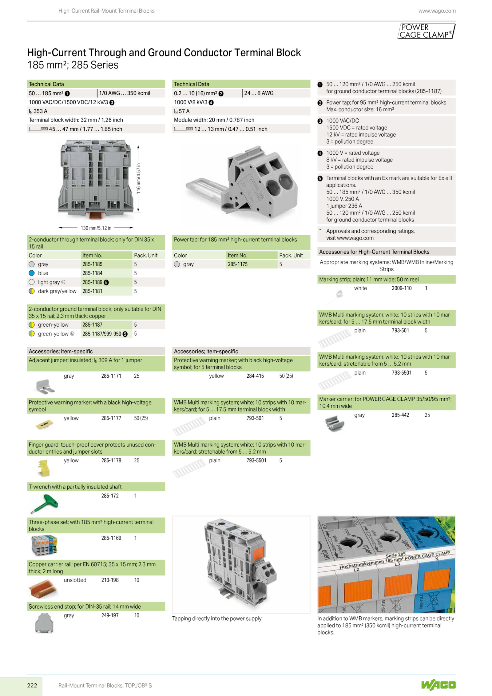 222 130 mm/5. .2 mm plain 793-5501 5 Marker carrier; for POWER CAGE CLAMP 35/50/95 mm²; 10. Unit Color Item No.2 mm yellow 285-1178 plain 793-5501 5 T-wrench with partially insulated shaft 285-172 1 Three-phase set; with 185 mm² high-current terminal blocks 285-1169 1 Copper carrier rail; per 60715; mm; 2. conductor size: mm² 3 1000 VAC/DC 1500 VDC rated voltage 12 rated impulse voltage 3 pollution degree 4 1000 rated voltage 8 rated impulse voltage 3 pollution degree 5 Terminal blocks with mark are suitable for II applications.51 inch 2-conductor through terminal block; only for DIN x 15 rail Power tap; for 185 mm² high-current terminal blocks Color Item No.2 (16) mm² AWG 1000 VAC/DC/1500 VDC/12 kV/3 1000 V/8 kV/3 4 IN 353 A Terminal block width: 1.47 0. Pack. 50 185 mm² 1/0 AWG 350 kcmil 1000 250 A 1 jumper 236 A 50 120 mm² 1/0 AWG 250 kcmil for ground conductor terminal blocks “ Approvals and corresponding ratings, visit www.57 in www.wago. Unit gray 285-1185 gray 285-1175 5 blue 285-1184 5 light gray 285-1189 5 dark gray/yellow 285-1181 5 2-conductor ground terminal block; only suitable for DIN 35 rail; 2.3 mm thick; long unslotted 210-198 10 Screwless end stop; for DIN-35 rail; wide Platzhalter 249-197 Endklammer Maße fehlen noch gray 249-197 10 1 120 mm² 1/0 AWG 250 kcmil for ground conductor terminal blocks (285‑1187) 2 Power tap; for mm² high-current terminal blocks Max.77 1.com Tapping directly into the power supply.85 inch 0.12 in 116 mm/4.3 thick; copper green-yellow 285-1187 5 green-yellow 285-1187/999-950 5 Accessories; item-specific Accessories; item-specific Adjacent jumper; insulated; 309 for jumper Protective warning marker; with black high-voltage symbol; for terminal blocks gray 285-1171 yellow 284-415 (25) Protective warning marker; with black high-voltage symbol WMB Multi marking system; white; strips with mar- kers/card; for 17.787 inch L 1.4 wide gray 285-442 25 In addition WMB markers, marking strips can directly applied 185 mm² (350 kcmil) high-current terminal blocks. Pack.5 terminal block width yellow 285-1177 (25) plain 793-501 5 Finger guard; touch-proof cover protects unused con- ductor entries and jumper slots WMB Multi marking system; white; strips with mar- kers/card; stretchable from 5.26 inch Module width: 0. Accessories for High-Current Terminal Blocks Appropriate marking systems: WMB/WMB Inline/Marking Strips Marking strip; plain; wide; reel white 2009-110 1 WMB Multi marking system; white; strips with mar- kers/card; for 17.5 terminal block width plain 793-501 5 WMB Multi marking system; white; strips with mar- kers/card; stretchable from 5.wago.com Rail-Mount Terminal Blocks, TOPJOB® S High-Current Rail-Mount Terminal Blocks 185 mm²; 285 Series High-Current Through and Ground Conductor Terminal Block Technical Data Technical Data 50 185 mm² 1/0 AWG 350 kcmil 0