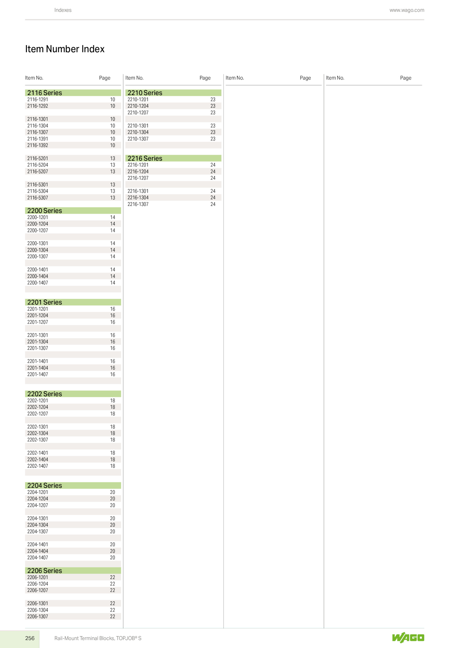 256 www.com Rail-Mount Terminal Blocks, TOPJOB® S Indexes Item No. Item No. Item No.wago. Page Page Page Page 2116 Series 2116-1291 10 2116-1292 10 2116-1301 10 2116-1304 10 2116-1307 10 2116-1391 10 2116-1392 10 2116-5201 13 2116-5204 13 2116-5207 13 2116-5301 13 2116-5304 13 2116-5307 13 2200 Series 2200-1201 14 2200-1204 14 2200-1207 14 2200-1301 14 2200-1304 14 2200-1307 14 2200-1401 14 2200-1404 14 2200-1407 14 2201 Series 2201-1201 16 2201-1204 16 2201-1207 16 2201-1301 16 2201-1304 16 2201-1307 16 2201-1401 16 2201-1404 16 2201-1407 16 2202 Series 2202-1201 18 2202-1204 18 2202-1207 18 2202-1301 18 2202-1304 18 2202-1307 18 2202-1401 18 2202-1404 18 2202-1407 18 2204 Series 2204-1201 20 2204-1204 20 2204-1207 20 2204-1301 20 2204-1304 20 2204-1307 20 2204-1401 20 2204-1404 20 2204-1407 20 2206 Series 2206-1201 22 2206-1204 22 2206-1207 22 2206-1301 22 2206-1304 22 2206-1307 22 2210 Series 2210-1201 23 2210-1204 23 2210-1207 23 2210-1301 23 2210-1304 23 2210-1307 23 2216 Series 2216-1201 24 2216-1204 24 2216-1207 24 2216-1301 24 2216-1304 24 2216-1307 24 Item Number Index . Item No