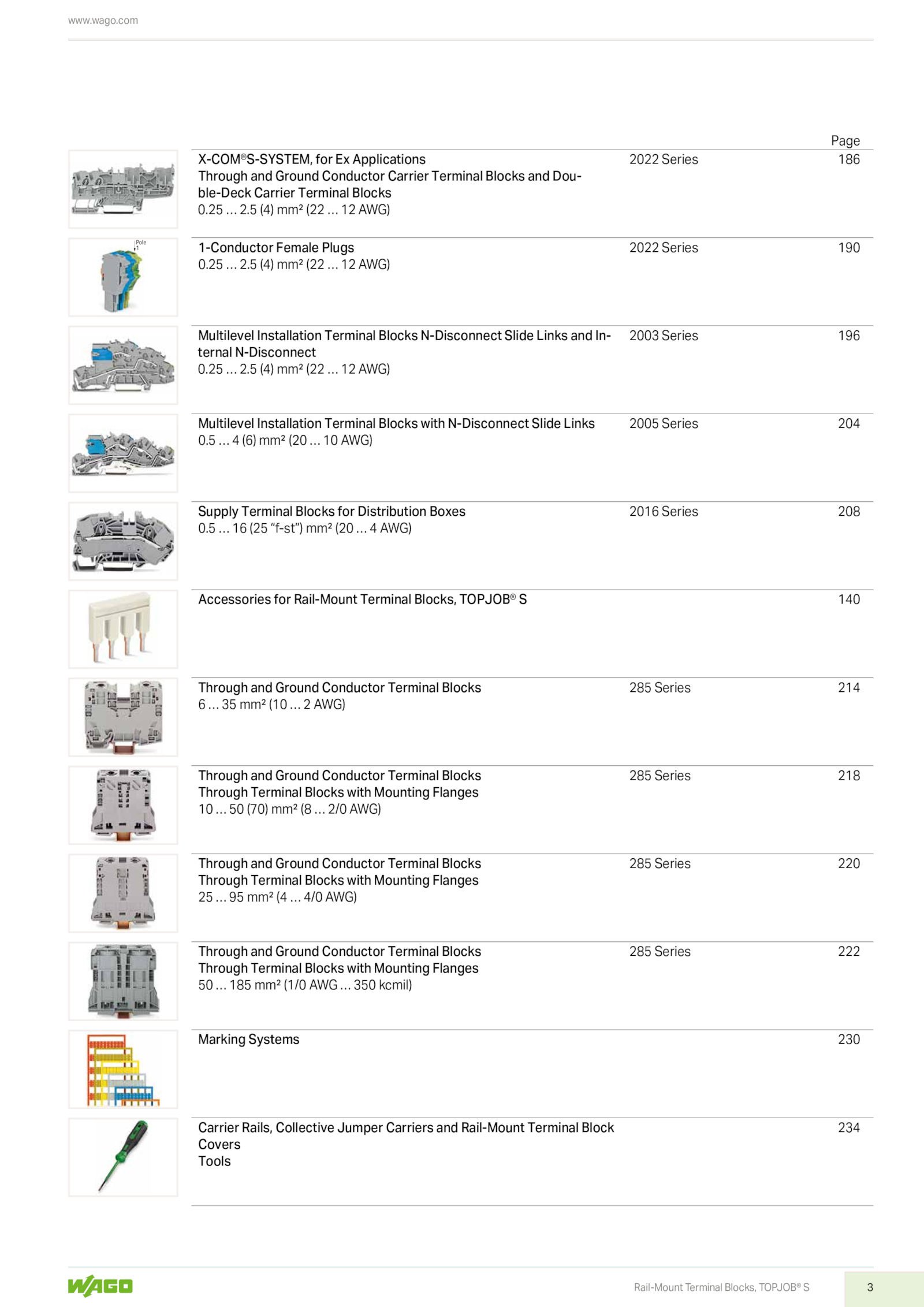 5 (25 “f-st”) mm² (20 AWG) 2016 Series 208 Accessories for Rail-Mount Terminal Blocks, TOPJOB® 140 Through and Ground Conductor Terminal Blocks 6 mm² (10 AWG) 285 Series 214 Through and Ground Conductor Terminal Blocks Through Terminal Blocks with Mounting Flanges 10 (70) mm² 2/0 AWG) 285 Series 218 Through and Ground Conductor Terminal Blocks Through Terminal Blocks with Mounting Flanges 25 mm² 4/0 AWG) 285 Series 220 Through and Ground Conductor Terminal Blocks Through Terminal Blocks with Mounting Flanges 50 185 mm² (1/0 AWG 350 kcmil) 285 Series 222 Marking Systems 230 Carrier Rails, Collective Jumper Carriers and Rail-Mount Terminal Block Covers Tools 234 .25 2.25 2.5 (4) mm² (22 AWG) 2022 Series 190 Multilevel Installation Terminal Blocks N-Disconnect Slide Links and In- ternal N-Disconnect 0.3 Pole 1 www.25 2.5 (4) mm² (22 AWG) 2022 Series 186 1-Conductor Female Plugs 0.5 (6) mm² (20 AWG) 2005 Series 204 Supply Terminal Blocks for Distribution Boxes 0.com Rail-Mount Terminal Blocks, TOPJOB® S Page X-COM®S-SYSTEM, for Applications Through and Ground Conductor Carrier Terminal Blocks and Dou- ble-Deck Carrier Terminal Blocks 0.wago.5 (4) mm² (22 AWG) 2003 Series 196 Multilevel Installation Terminal Blocks with N-Disconnect Slide Links 0