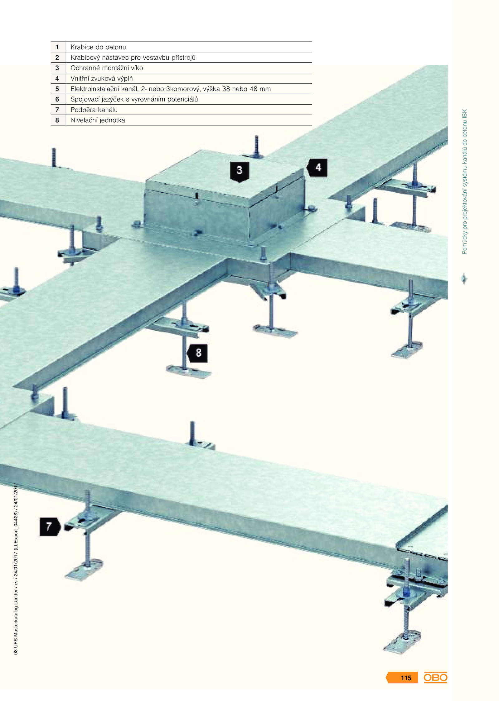 08 UFS Masterkatalog Länder / cs / 24/01/2017 (LLExport_04428) / 24/01/2017 1 Krabice betonu 2 Krabicový nástavec pro vestavbu přístrojů 3 Ochranné montážní víko 4 Vnitřní zvuková výplň 5 Elektroinstalační kanál, nebo 3komorový, výška nebo mm 6 Spojovací jazýček vyrovnáním potenciálů 7 Podpěra kanálu 8 Nivelační jednotka Pomůcky pro projektování systému kanálů do betonu IBK 08 UFS Masterkatalog Länder / cs / 24/01/2017 (LLExport_04428) / 24/01/2017 115