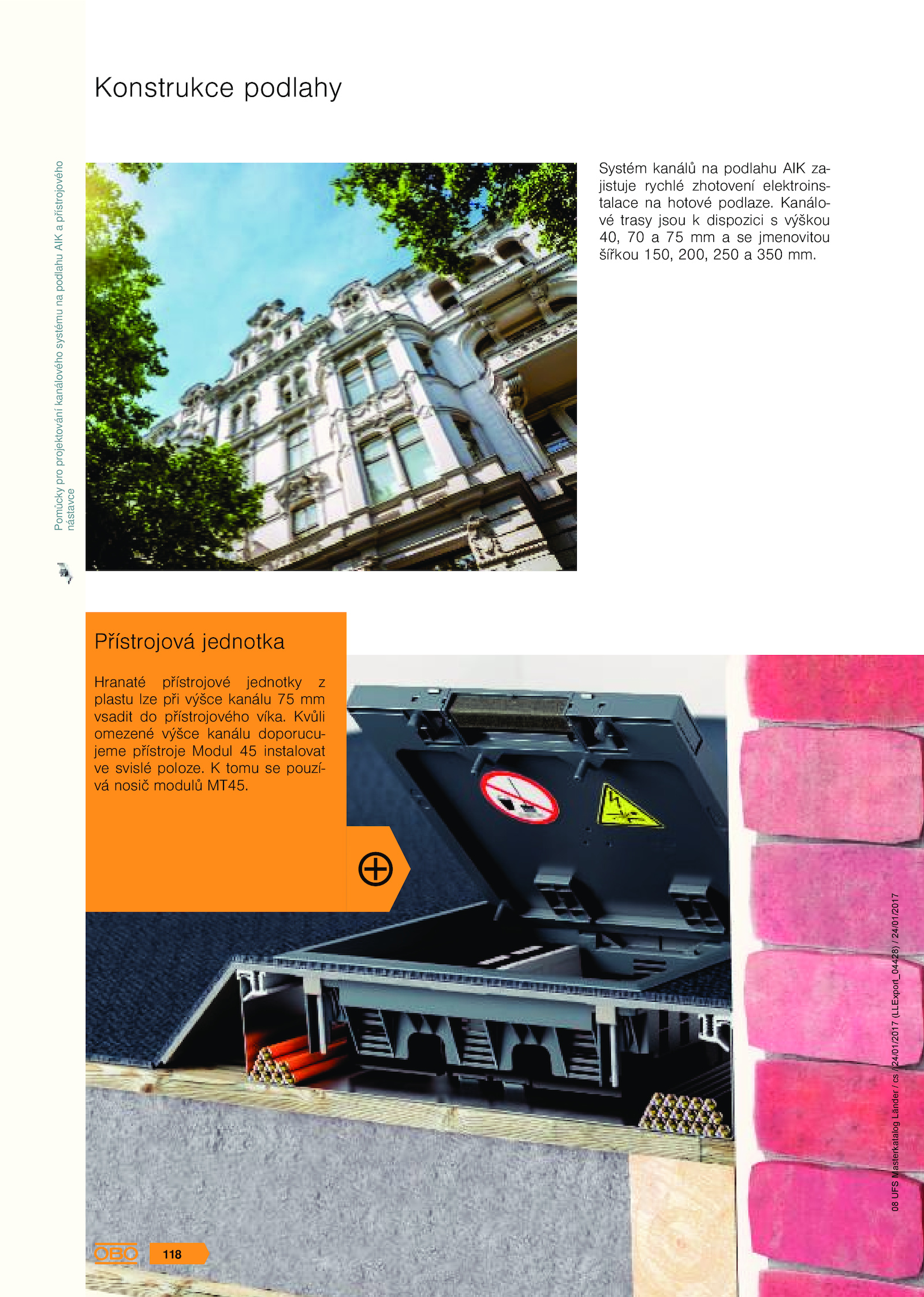 Přístrojová jednotka Hranaté přístrojové jednotky z plastu lze při výšce kanálu mm vsadit přístrojového víka. Pomůcky pro projektování kanálového systému na podlahu AIK a přístrojového nástavce 08 UFS Masterkatalog Länder / cs / 24/01/2017 (LLExport_04428) / 24/01/2017 118 . Kanálo- vé trasy jsou dispozici výškou 40, jmenovitou šířkou 150, 200, 250 350 mm.Konstrukce podlahy Systém kanálů podlahu AIK za- jistuje rychlé zhotovení elektroins- talace hotové podlaze. tomu pouzí- vá nosič modulů MT45. Kvůli omezené výšce kanálu doporucu- jeme přístroje Modul instalovat ve svislé poloze