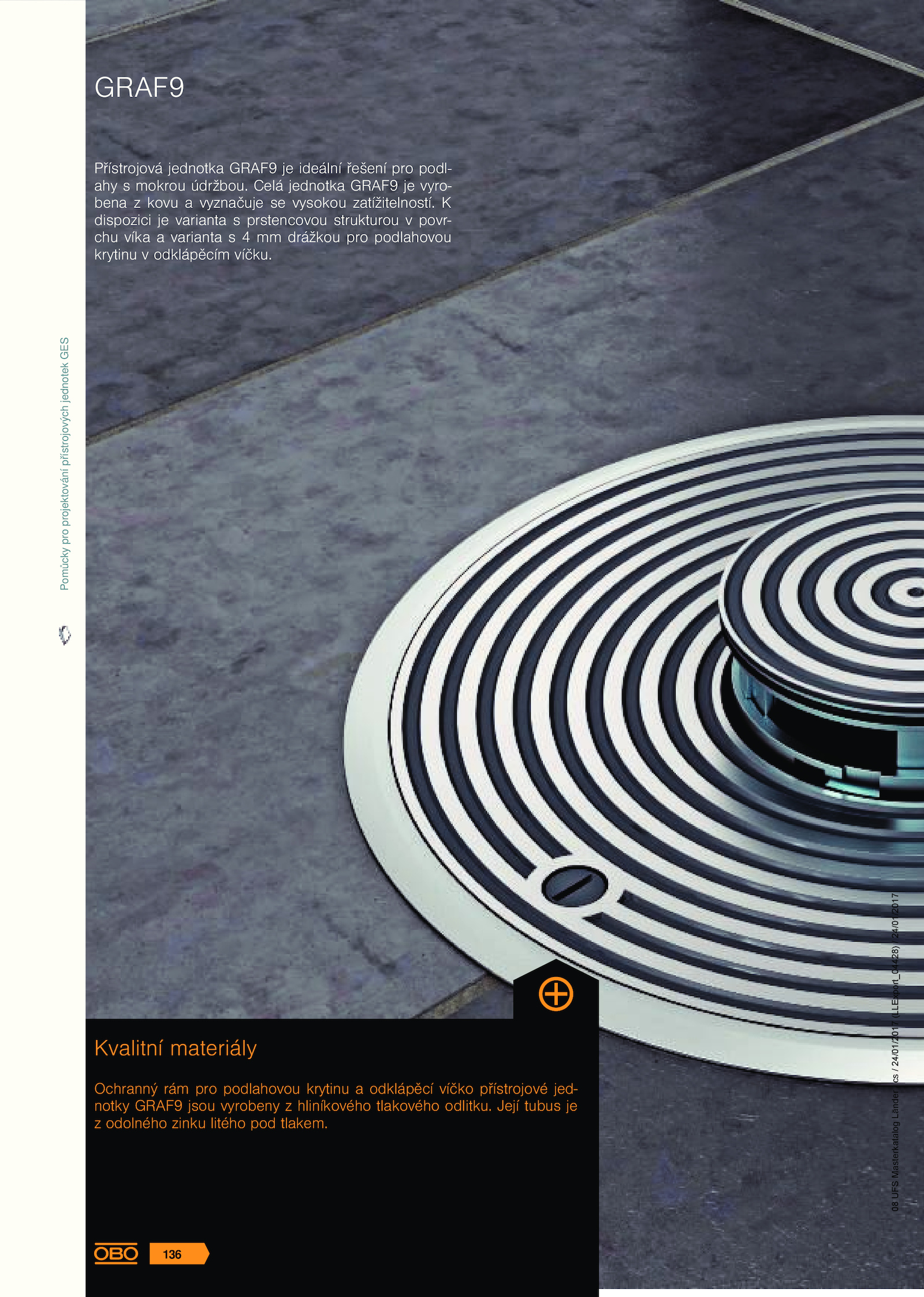 Celá jednotka GRAF9 vyro- bena kovu vyznačuje vysokou zatížitelností. Kvalitní materiály Ochranný rám pro podlahovou krytinu odklápěcí víčko přístrojové jed- notky GRAF9 jsou vyrobeny hliníkového tlakového odlitku. Její tubus je z odolného zinku litého pod tlakem. Pomůcky pro projektování přístrojových jednotek GES 08 UFS Masterkatalog Länder / cs / 24/01/2017 (LLExport_04428) / 24/01/2017 136 . K dispozici varianta prstencovou strukturou povr- chu víka varianta drážkou pro podlahovou krytinu odklápěcím víčku.GRAF9 Přístrojová jednotka GRAF9 ideální řešení pro podl- ahy mokrou údržbou