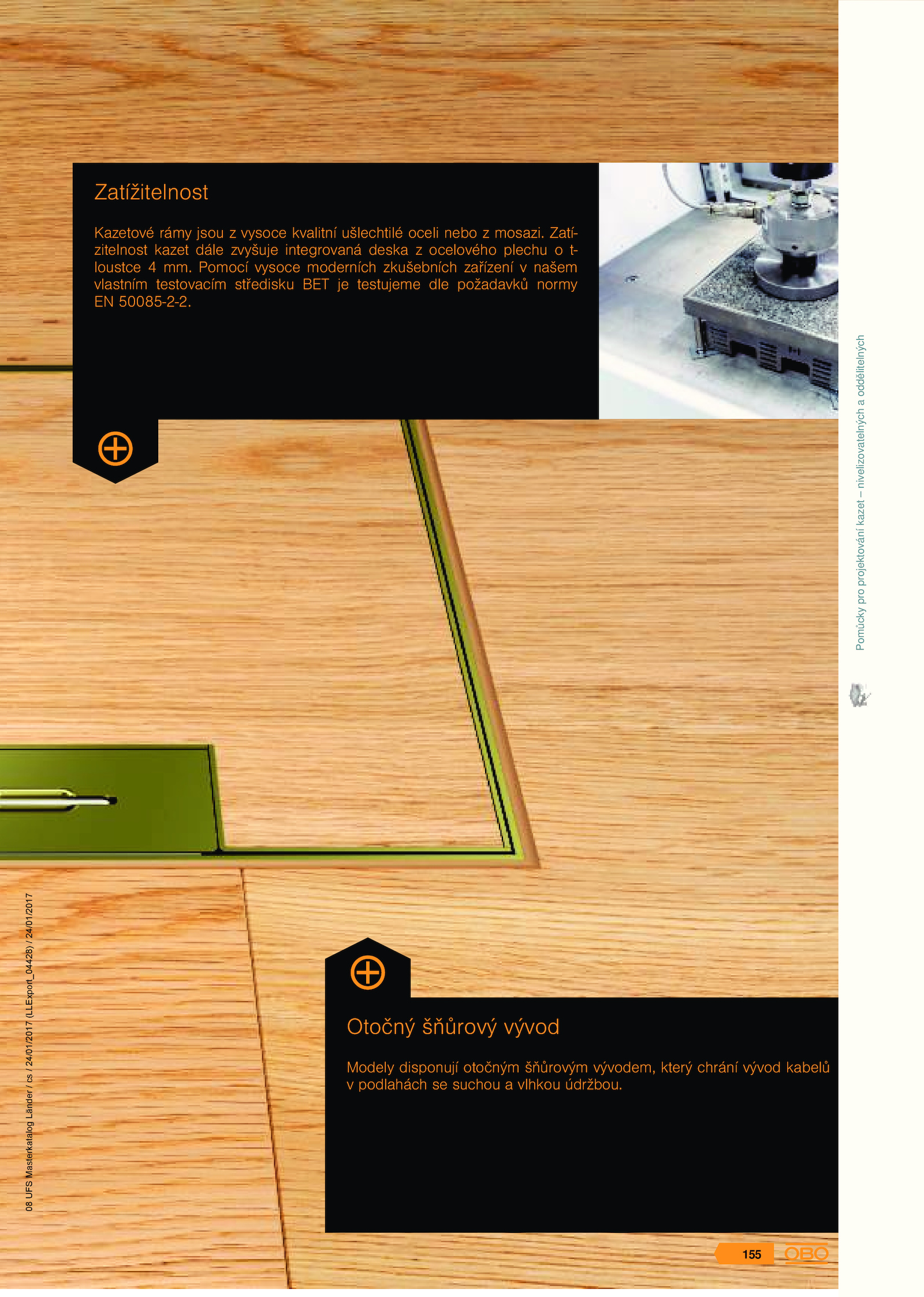 08 UFS Masterkatalog Länder / cs / 24/01/2017 (LLExport_04428) / 24/01/2017 Zatížitelnost Kazetové rámy jsou vysoce kvalitní ušlechtilé oceli nebo mosazi. Otočný šňůrový vývod Modely disponují otočným šňůrovým vývodem, který chrání vývod kabelů v podlahách suchou vlhkou údržbou. Zatí- zitelnost kazet dále zvyšuje integrovaná deska ocelového plechu t- loustce mm. Pomůcky pro projektování kazet – nivelizovatelných a oddělitelných 08 UFS Masterkatalog Länder / cs / 24/01/2017 (LLExport_04428) / 24/01/2017 155 . Pomocí vysoce moderních zkušebních zařízení našem vlastním testovacím středisku BET testujeme dle požadavků normy EN 50085-2-2