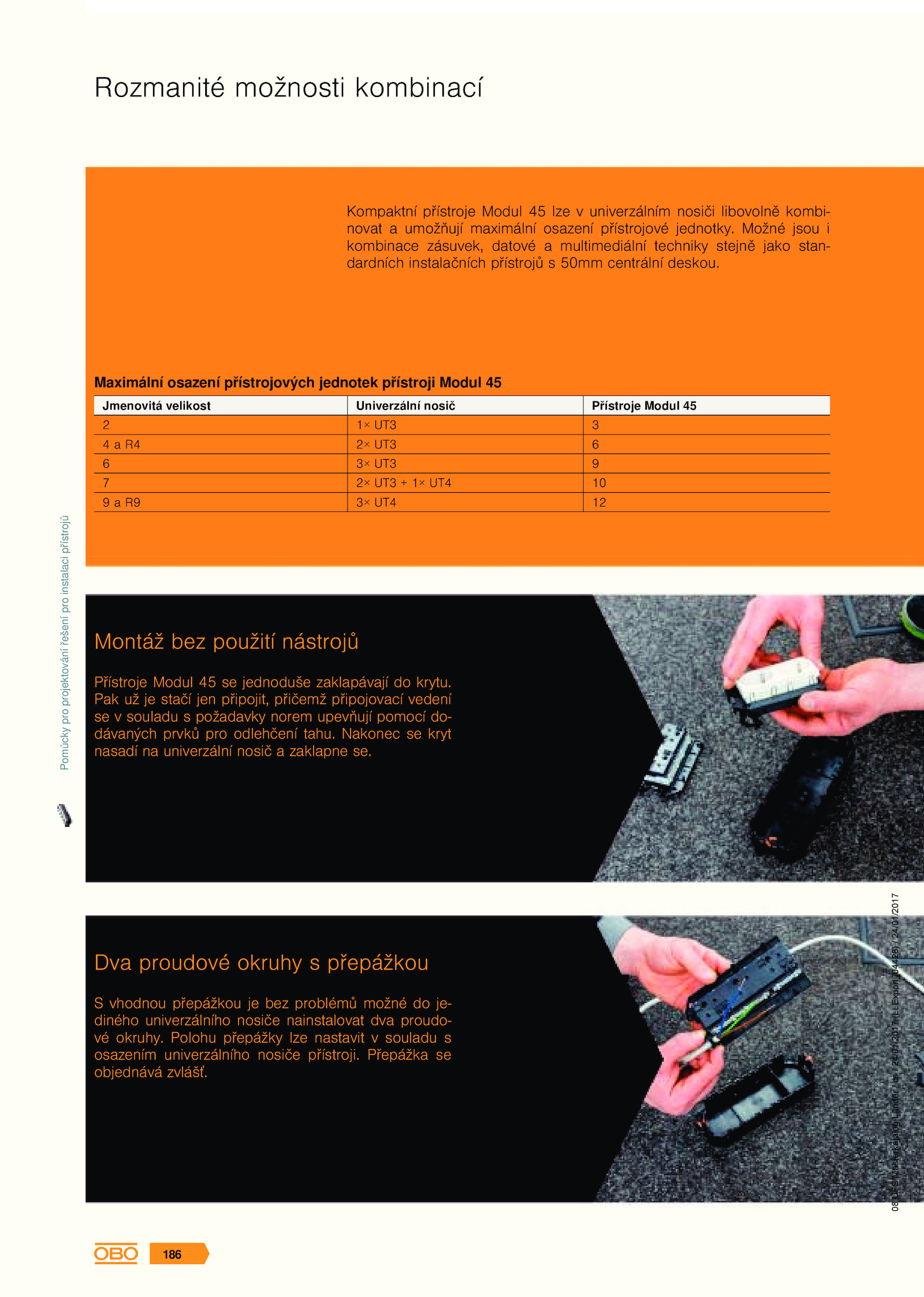 Pak stačí jen připojit, přičemž připojovací vedení se souladu požadavky norem upevňují pomocí do- dávaných prvků pro odlehčení tahu. Nakonec kryt nasadí univerzální nosič zaklapne se. Maximální osazení přístrojových jednotek přístroji Modul 45 Jmenovitá velikost Univerzální nosič Přístroje Modul 45 2 UT3 3 4 UT3 6 6 UT3 9 7 UT3 UT4 10 9 UT4 12 Montáž bez použití nástrojů Přístroje Modul jednoduše zaklapávají krytu. Možné jsou i kombinace zásuvek, datové multimediální techniky stejně jako stan- dardních instalačních přístrojů 50mm centrální deskou. Přepážka se objednává zvlášť. Pomůcky pro projektování řešení pro instalaci přístrojů 08 UFS Masterkatalog Länder / cs / 24/01/2017 (LLExport_04428) / 24/01/2017 186 . Dva proudové okruhy přepážkou S vhodnou přepážkou bez problémů možné je- diného univerzálního nosiče nainstalovat dva proudo- vé okruhy. Polohu přepážky lze nastavit souladu s osazením univerzálního nosiče přístroji.Rozmanité možnosti kombinací Kompaktní přístroje Modul lze univerzálním nosiči libovolně kombi- novat umožňují maximální osazení přístrojové jednotky