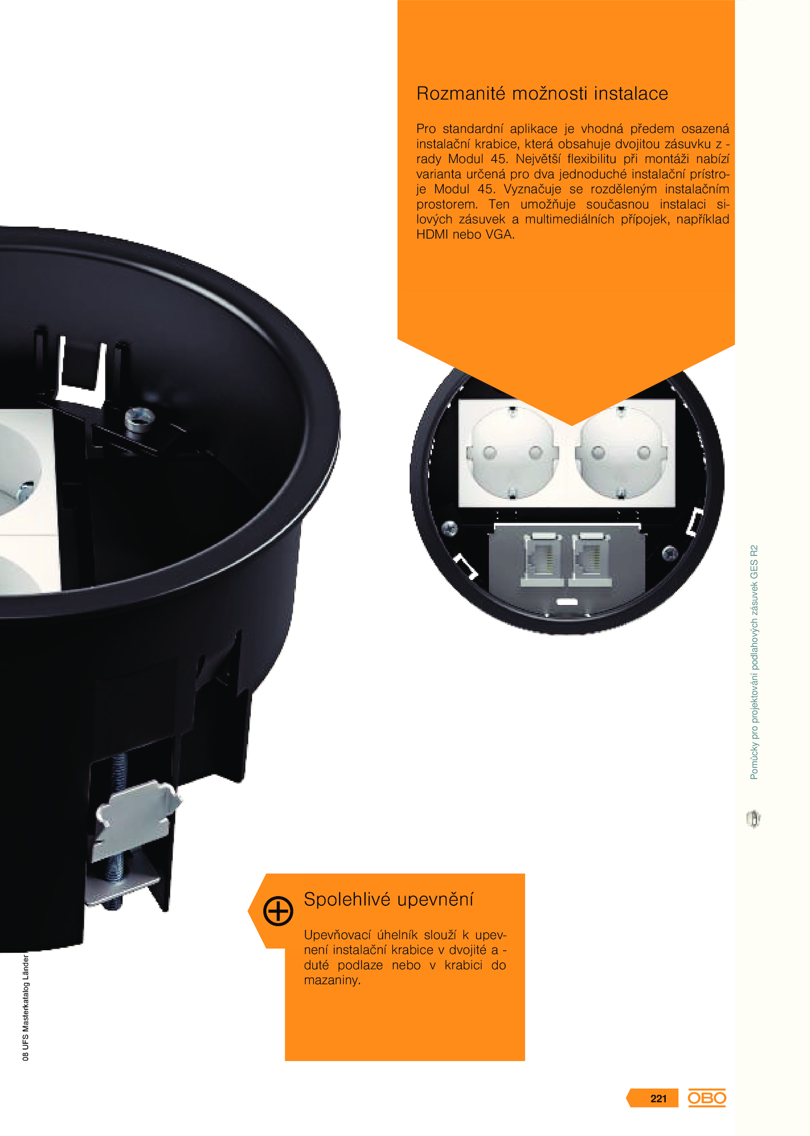 Ten umožňuje současnou instalaci si- lových zásuvek multimediálních přípojek, například HDMI nebo VGA. Pomůcky pro projektování podlahových zásuvek GES R2 08 UFS Masterkatalog Länder / cs / 24/01/2017 (LLExport_04428) / 24/01/2017 221 . Spolehlivé upevnění Upevňovací úhelník slouží upev- není instalační krabice dvojité - duté podlaze nebo krabici do mazaniny.08 UFS Masterkatalog Länder / cs / 24/01/2017 (LLExport_04428) / 24/01/2017 Rozmanité možnosti instalace Pro standardní aplikace vhodná předem osazená instalační krabice, která obsahuje dvojitou zásuvku - rady Modul 45. Největší flexibilitu při montáži nabízí varianta určená pro dva jednoduché instalační prístro- je Modul 45. Vyznačuje rozděleným instalačním prostorem