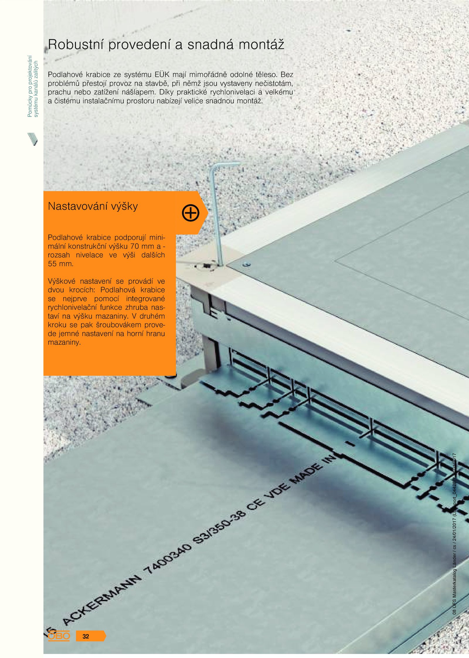 Bez problémů přestojí provoz stavbě, při němž jsou vystaveny nečistotám, prachu nebo zatížení nášlapem. Výškové nastavení provádí ve dvou krocích: Podlahová krabice se nejprve pomocí integrované rychlonivelační funkce zhruba nas- taví výšku mazaniny. Díky praktické rychlonivelaci velkému a čistému instalačnímu prostoru nabízejí velice snadnou montáž. Nastavování výšky Podlahové krabice podporují mini- mální konstrukční výšku - rozsah nivelace výši dalších 55 mm. Pomůcky pro projektování systému kanálů zalitých 08 UFS Masterkatalog Länder / cs / 24/01/2017 (LLExport_04428) / 24/01/2017 32 . druhém kroku pak šroubovákem prove- de jemné nastavení horní hranu mazaniny.Robustní provedení snadná montáž Podlahové krabice systému EÜK mají mimořádně odolné těleso