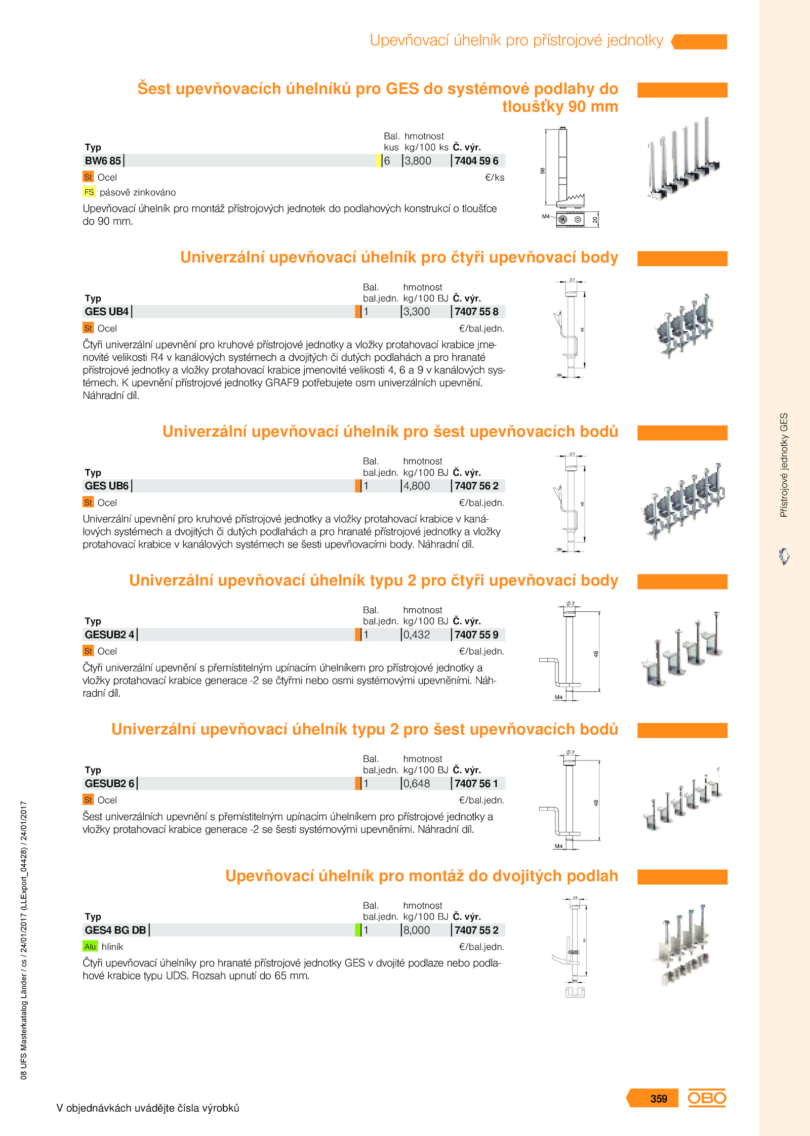 Náhradní díl. 1 hmotnost kg/100 BJ 8,000 M4 8 58 Čtyři upevňovací úhelníky pro hranaté přístrojové jednotky GES dvojité podlaze nebo podla- hové krabice typu UDS.jedn. Alu hliník €/bal. 1 hmotnost kg/100 BJ 3,300 48 M4 7 Čtyři univerzální upevnění pro kruhové přístrojové jednotky vložky protahovací krabice jme- novité velikosti kanálových systémech dvojitých dutých podlahách pro hranaté přístrojové jednotky vložky protahovací krabice jmenovité velikosti kanálových sys- témech. 1 hmotnost kg/100 BJ 4,800 48 M4 7 Univerzální upevnění pro kruhové přístrojové jednotky vložky protahovací krabice kaná- lových systémech dvojitých dutých podlahách pro hranaté přístrojové jednotky vložky protahovací krabice kanálových systémech šesti upevňovacími body. Náhradní díl. Univerzální upevňovací úhelník pro šest upevňovacích bodů Typ GES UB6 Č. Náhradní díl.jedn.jedn. 1 hmotnost kg/100 BJ 0,432 7 48 M4 Čtyři univerzální upevnění přemístitelným upínacím úhelníkem pro přístrojové jednotky a vložky protahovací krabice generace čtyřmi nebo osmi systémovými upevněními. St Ocel €/bal.jedn. bal.08 UFS Masterkatalog Länder / cs / 24/01/2017 (LLExport_04428) / 24/01/2017 V objednávkách uvádějte čísla výrobků Upevňovací úhelník pro přístrojové jednotky Přístrojové jednotky GES 359 Šest upevňovacích úhelníků pro GES systémové podlahy do tloušťky mm Typ BW6 85 Č. výr. výr. 7407 1 Bal.jedn. výr. Univerzální upevňovací úhelník typu pro čtyři upevňovací body Typ GESUB2 4 Č. 7407 2 Bal. St Ocel €/bal. bal. 7407 9 Bal. Upevňovací úhelník pro montáž dvojitých podlah Typ GES4 DB Č. kus 6 hmotnost kg/100 ks 3,800 96 M4 20 Upevňovací úhelník pro montáž přístrojových jednotek podlahových konstrukcí tloušťce do mm. bal. 1 hmotnost kg/100 BJ 0,648 7 48 M4 Šest univerzálních upevnění přemístitelným upínacím úhelníkem pro přístrojové jednotky a vložky protahovací krabice generace šesti systémovými upevněními. Náh- radní díl. St Ocel €/bal.jedn.jedn. 7404 6 Bal. 7407 2 Bal. výr. výr. bal. výr. 7407 8 Bal.jedn. Rozsah upnutí mm. upevnění přístrojové jednotky GRAF9 potřebujete osm univerzálních upevnění. Univerzální upevňovací úhelník typu pro šest upevňovacích bodů Typ GESUB2 6 Č. . St Ocel FS pásově zinkováno €/ks Univerzální upevňovací úhelník pro čtyři upevňovací body Typ GES UB4 Č.jedn.jedn. bal. St Ocel €/bal