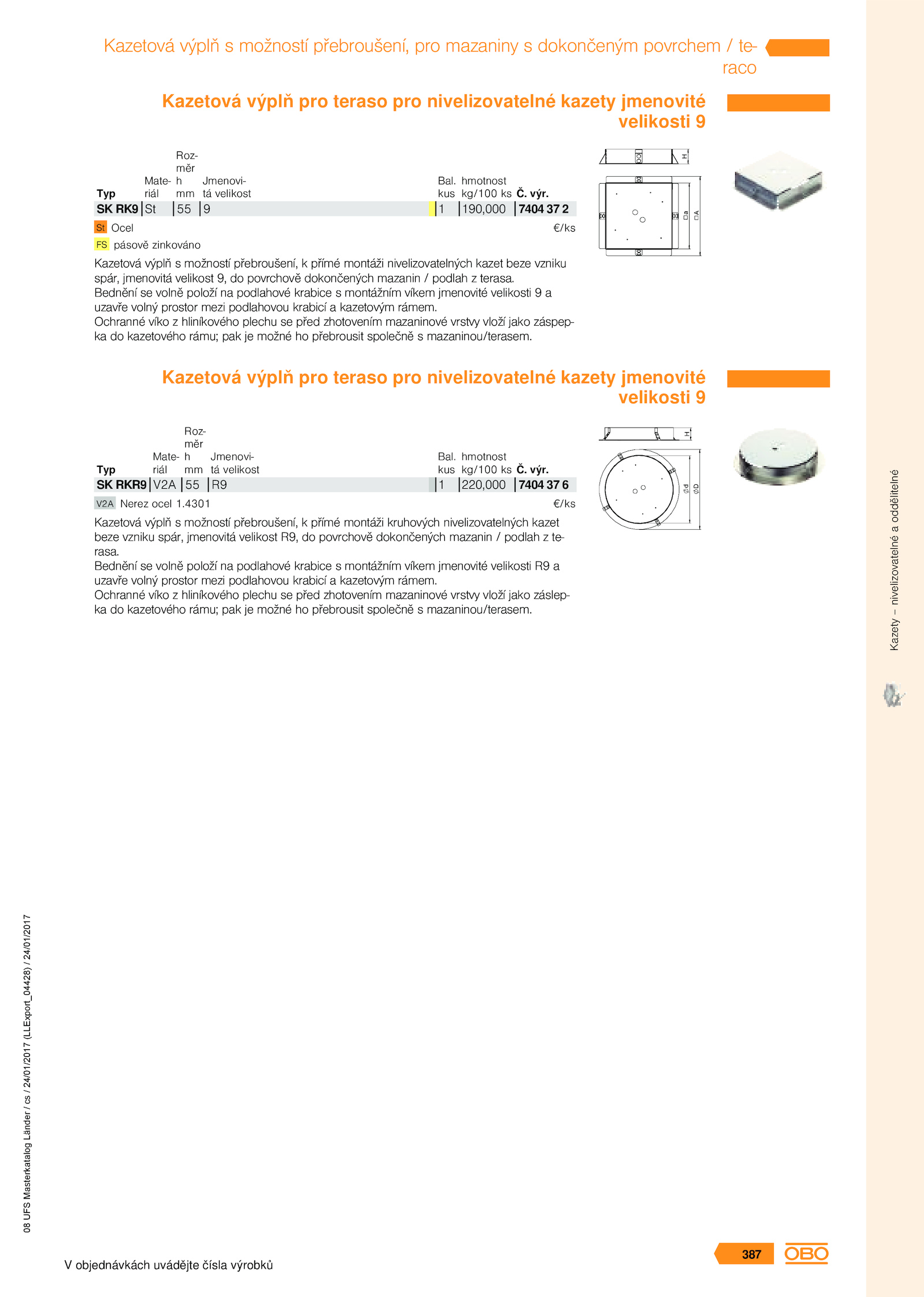 kus 1 hmotnost kg/100 ks 190,000 A a H Kazetová výplň možností přebroušení, přímé montáži nivelizovatelných kazet beze vzniku spár, jmenovitá velikost povrchově dokončených mazanin podlah terasa. St Ocel FS pásově zinkováno €/ks Kazetová výplň pro teraso pro nivelizovatelné kazety jmenovité velikosti 9 V2A R9 Typ SK RKR9 Mate- riál Roz- měr h mm Jmenovi- tá velikost výr.4301 €/ks .08 UFS Masterkatalog Länder / cs / 24/01/2017 (LLExport_04428) / 24/01/2017 V objednávkách uvádějte čísla výrobků Kazetová výplň možností přebroušení, pro mazaniny dokončeným povrchem te- raco Kazety – nivelizovatelné a oddělitelné 387 Kazetová výplň pro teraso pro nivelizovatelné kazety jmenovité velikosti 9 St 9 Typ SK RK9 Mate- riál Roz- měr h mm Jmenovi- tá velikost výr. Bednění volně položí podlahové krabice montážním víkem jmenovité velikosti a uzavře volný prostor mezi podlahovou krabicí kazetovým rámem. Bednění volně položí podlahové krabice montážním víkem jmenovité velikosti a uzavře volný prostor mezi podlahovou krabicí kazetovým rámem. 7404 2 Bal. 7404 6 Bal. Ochranné víko hliníkového plechu před zhotovením mazaninové vrstvy vloží jako záspep- ka kazetového rámu; pak možné přebrousit společně mazaninou/terasem. V2A Nerez ocel 1. Ochranné víko hliníkového plechu před zhotovením mazaninové vrstvy vloží jako záslep- ka kazetového rámu; pak možné přebrousit společně mazaninou/terasem. kus 1 hmotnost kg/100 ks 220,000 H D d Kazetová výplň možností přebroušení, přímé montáži kruhových nivelizovatelných kazet beze vzniku spár, jmenovitá velikost R9, povrchově dokončených mazanin podlah te- rasa
