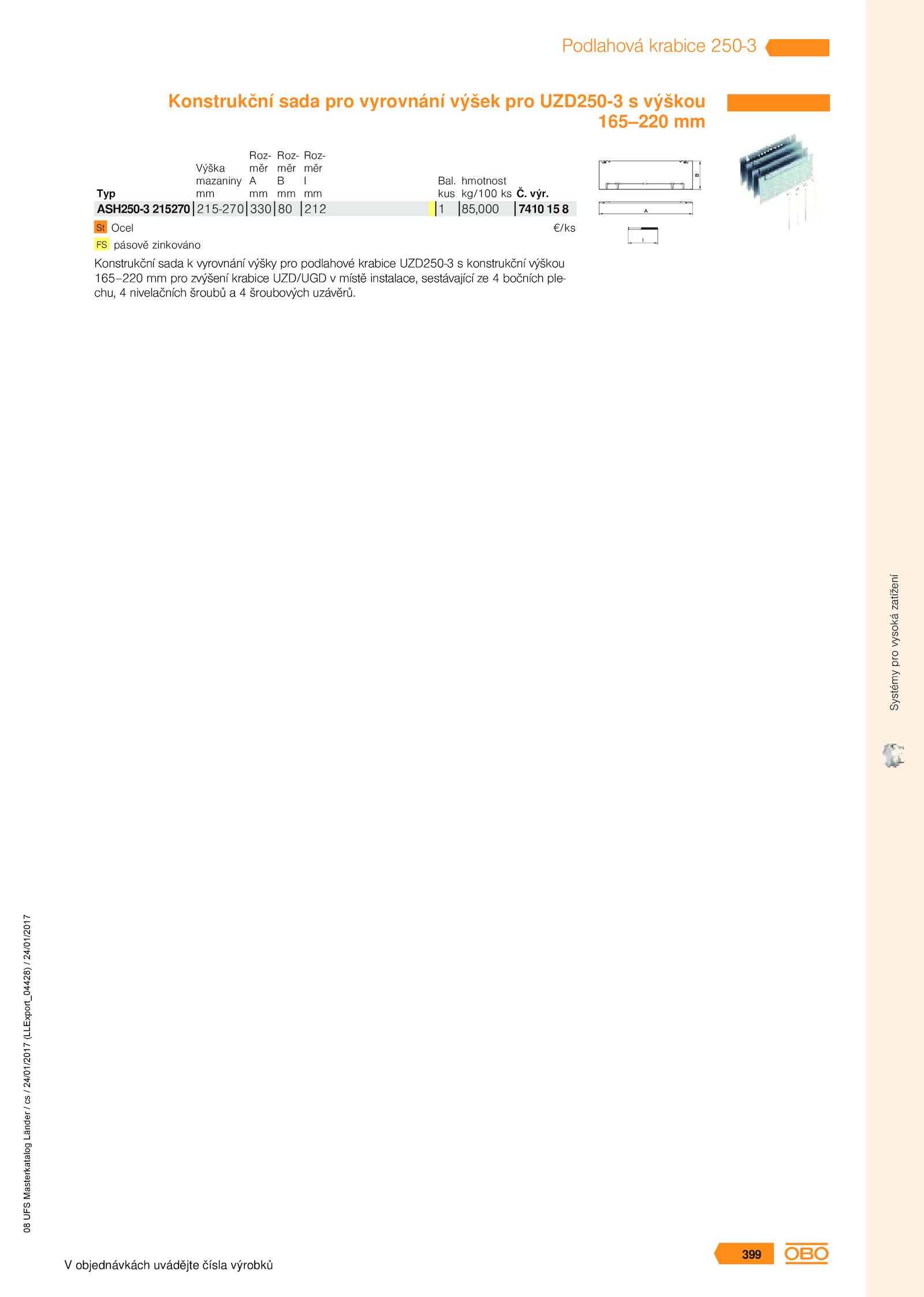 7410 8 Bal.08 UFS Masterkatalog Länder / cs / 24/01/2017 (LLExport_04428) / 24/01/2017 V objednávkách uvádějte čísla výrobků Podlahová krabice 250-3 Systémy pro vysoká zatížení 399 Konstrukční sada pro vyrovnání výšek pro UZD250-3 výškou 165–220 mm 215-270 330 212 Typ ASH250-3 215270 Výška mazaniny mm Roz- měr A mm Roz- měr B mm Roz- měr l mm výr. kus 1 hmotnost kg/100 ks 85,000 Konstrukční sada vyrovnání výšky pro podlahové krabice UZD250-3 konstrukční výškou 165–220 pro zvýšení krabice UZD/UGD místě instalace, sestávající bočních ple- chu, nivelačních šroubů šroubových uzávěrů. St Ocel FS pásově zinkováno €/ks