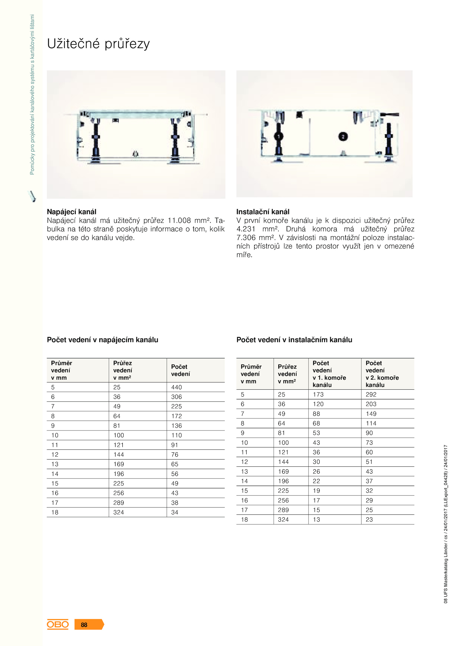 306 mm². Instalační kanál V první komoře kanálu dispozici užitečný průřez 4.231 mm².Užitečné průřezy Napájecí kanál Napájecí kanál užitečný průřez 11. Počet vedení napájecím kanálu Počet vedení instalačním kanálu Průměr vedení v mm Průřez vedení v mm² Počet vedení 5 440 6 306 7 225 8 172 9 136 10 100 110 11 121 91 12 144 76 13 169 65 14 196 56 15 225 49 16 256 43 17 289 38 18 324 34 Průměr vedení v mm Průřez vedení v mm² Počet vedení v komoře kanálu Počet vedení v komoře kanálu 5 173 292 6 120 203 7 149 8 114 9 90 10 100 73 11 121 60 12 144 51 13 169 43 14 196 37 15 225 32 16 256 29 17 289 25 18 324 23 Pomůcky pro projektování kanálového systému s kartáčovými lištami 08 UFS Masterkatalog Länder / cs / 24/01/2017 (LLExport_04428) / 24/01/2017 88 . závislosti montážní poloze instalac- ních přístrojů lze tento prostor využít jen omezené míře. Ta- bulka této straně poskytuje informace tom, kolik vedení kanálu vejde.008 mm². Druhá komora užitečný průřez 7
