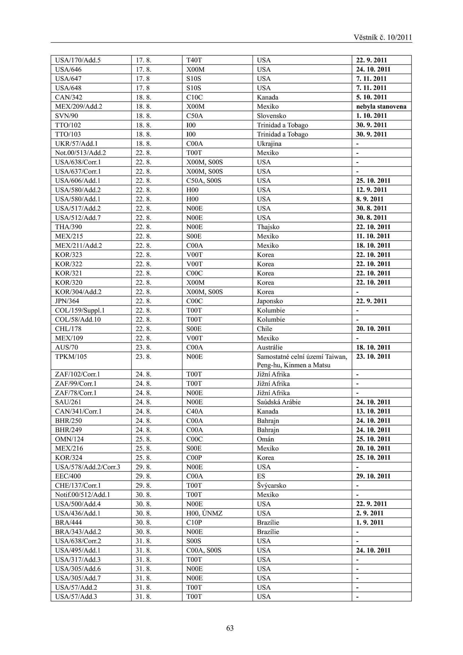 23. 10.2 KOR/323 KOR/322 KOR/321 KOR/320 KOR/304/Add. 18. 10. 17. 10. 31.10 CHL/178 MEX/109 AUS/70 TPKM/105 ZAF/102/Corr. 2011 22. 22. 2011 12. T40T X00M S10S S10S C10C X00M C50A I00 I00 C00A T00T X00M, S00S X00M, S00S C50A, S00S H00 H00 N00E N00E N00E S00E C00A V00T V00T C00C X00M X00M, S00S C00C T00T T00T S00E V00T C00A N00E T00T T00T N00E N00E C40A C00A C00A C00C S00E C00P N00E C00A T00T T00T N00E H00, ÚNMZ C10P N00E S00S C00A, S00S T00T N00E N00E T00T T00T USA USA USA USA Kanada Mexiko Slovensko Trinidad Tobago Trinidad Tobago Ukrajina Mexiko USA USA USA USA USA USA USA Thajsko Mexiko Mexiko Korea Korea Korea Korea Korea Japonsko Kolumbie Kolumbie Chile Mexiko Austrálie Samostatné celní území Taiwan, Peng-hu, Kinmen Matsu Jižní Afrika Jižní Afrika Jižní Afrika Saúdská Arábie Kanada Bahrajn Bahrajn Omán Mexiko Korea USA Švýcarsko Mexiko USA USA Brazílie Brazílie USA USA USA USA USA USA USA 22. 30.1 USA/637/Corr.2 USA/638/Corr. 23. 25. 2011 11.4 USA/436/Add. 2011 20.00/512/Add. 29.1 ZAF/99/Corr.3 USA/305/Add. 2011 24. 2011 25. 2011 24. 2011 30.1 Not. 2011 nebyla stanovena 10. 22. 22.5 USA/646 USA/647 USA/648 CAN/342 MEX/209/Add. 10. 30. 2011 11.2 USA/495/Add. 18.1 COL/58/Add. 17. 2011 22. 10. 30. 31. 2011 13. 24. 30.7 USA/57/Add. 31. 10.1 USA/317/Add. 2011 18. 2011 10. 22. 2011 2011 2011 24. 22. 2011 23. 2011 2011 30.1 BHR/250 BHR/249 OMN/124 MEX/216 KOR/324 USA/578/Add. 22.2 JPN/364 COL/159/Suppl. 10. 10. 2011 24. 2011 29. 22. 2011 20. 31.2 USA/57/Add. 2011 22. 10.1 SAU/261 CAN/341/Corr. 22. 17.3 EEC/400 CHE/137/Corr. 2011 25. 30. 24. 24.Věstník 10/2011