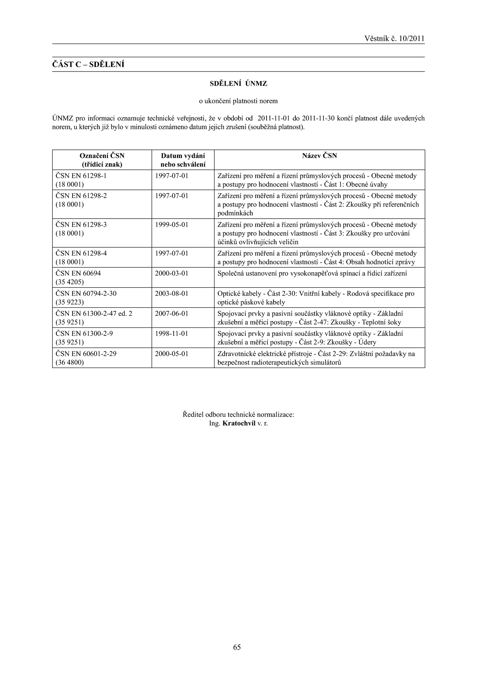 SDĚLENÍ ÚNMZ o ukončení platnosti norem ÚNMZ pro informaci oznamuje technické veřejnosti, v období 2011-11-01 2011-11-30 končí platnost dále uvedených norem, u kterých již bylo v minulosti oznámeno datum jejich zrušení (souběžná platnost). Kratochvíl r. (35 9251) ČSN 61300-2-9 (35 9251) ČSN 60601-2-29 (36 4800)