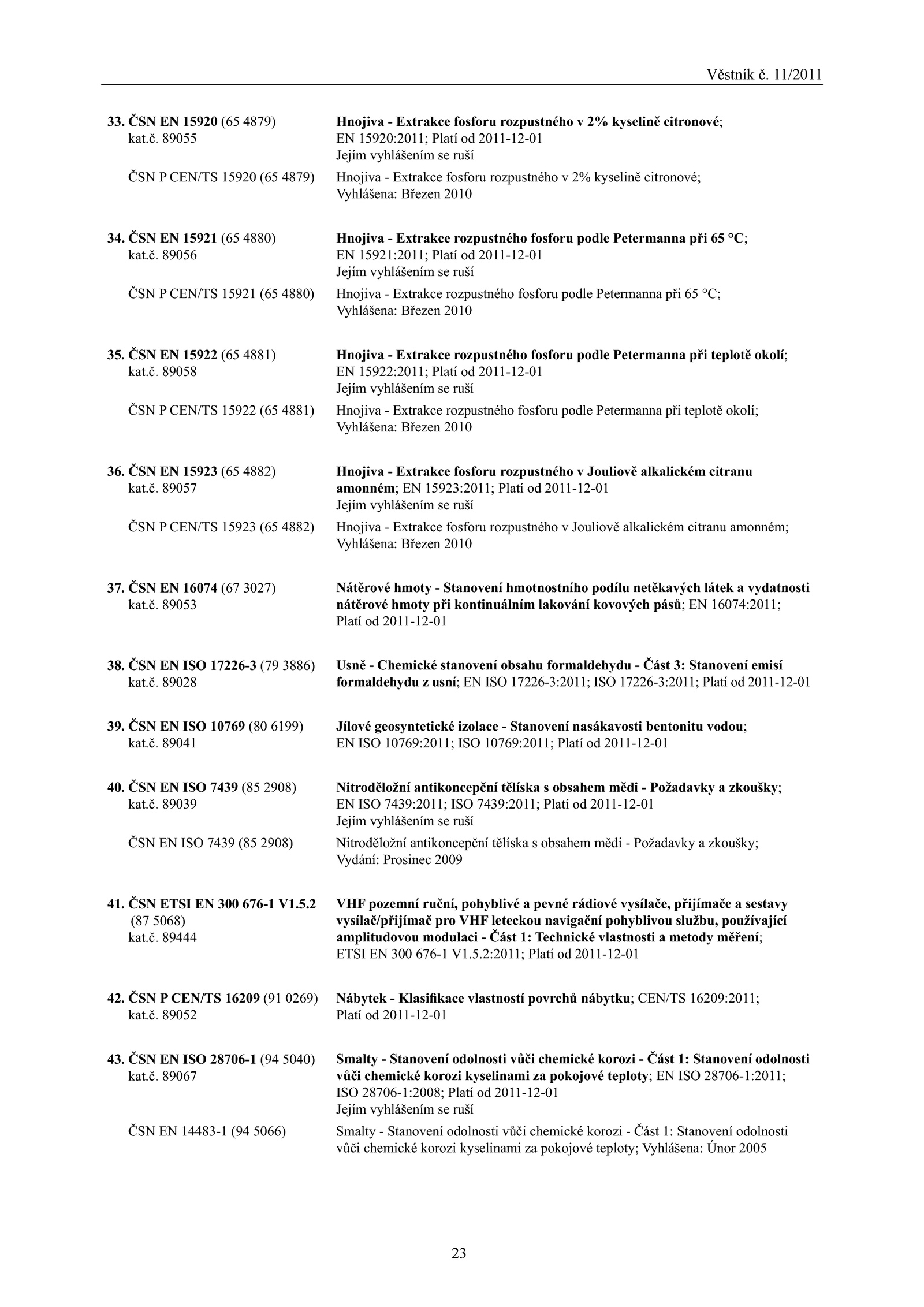33. 89052 43.5. 89041 40.č. ČSN 15921 (65 4880) kat. ČSN ISO 28706-1 (94 5040) kat. 89028 39. ČSN 15922 (65 4881) kat. ČSN ETSI 300 676-1 V1. ČSN ISO 17226-3 (79 3886) kat. 89055 ČSN P CEN/TS 15920 (65 4879) Hnojiva Extrakce fosforu rozpustného v 2% kyselině citronové; 15920:2011; Platí 2011-12-01 Jejím vyhlášením ruší Hnojiva Extrakce fosforu rozpustného v 2% kyselině citronové; Vyhlášena: Březen 2010 Hnojiva Extrakce rozpustného fosforu podle Petermanna při °C; 15921:2011; Platí 2011-12-01 Jejím vyhlášením ruší Hnojiva Extrakce rozpustného fosforu podle Petermanna při °C; Vyhlášena: Březen 2010 Hnojiva Extrakce rozpustného fosforu podle Petermanna při teplotě okolí; 15922:2011; Platí 2011-12-01 Jejím vyhlášením ruší Hnojiva Extrakce rozpustného fosforu podle Petermanna při teplotě okolí; Vyhlášena: Březen 2010 Hnojiva Extrakce fosforu rozpustného v Jouliově alkalickém citranu amonném; 15923:2011; Platí 2011-12-01 Jejím vyhlášením ruší Hnojiva Extrakce fosforu rozpustného v Jouliově alkalickém citranu amonném; Vyhlášena: Březen 2010 Nátěrové hmoty Stanovení hmotnostního podílu netěkavých látek a vydatnosti nátěrové hmoty při kontinuálním lakování kovových pásů; 16074:2011; Platí 2011-12-01 Usně Chemické stanovení obsahu formaldehydu Část Stanovení emisí formaldehydu z usní; ISO 17226-3:2011; ISO 17226-3:2011; Platí 2011-12-01 Jílové geosyntetické izolace Stanovení nasákavosti bentonitu vodou; ISO 10769:2011; ISO 10769:2011; Platí 2011-12-01 Nitroděložní antikoncepční tělíska s obsahem mědi Požadavky a zkoušky; ISO 7439:2011; ISO 7439:2011; Platí 2011-12-01 Jejím vyhlášením ruší Nitroděložní antikoncepční tělíska s obsahem mědi Požadavky a zkoušky; Vydání: Prosinec 2009 VHF pozemní ruční, pohyblivé a pevné rádiové vysílače, přijímače a sestavy vysílač/přijímač pro VHF leteckou navigační pohyblivou službu, používající amplitudovou modulaci Část Technické vlastnosti a metody měření; ETSI 300 676-1 V1. 89057 ČSN P CEN/TS 15923 (65 4882)