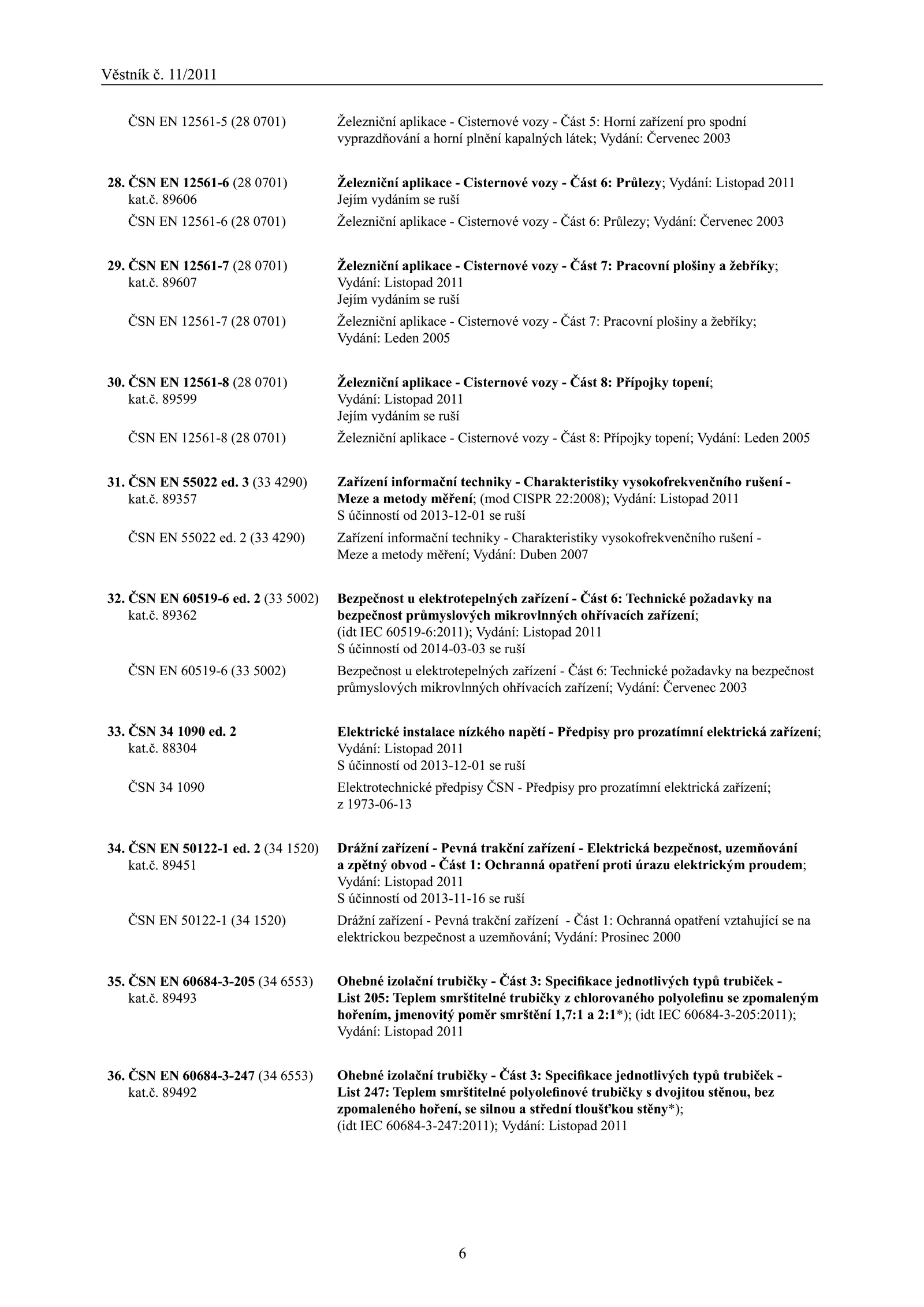 ČSN 12561-5 (28 0701) Železniční aplikace Cisternové vozy Část Horní zařízení pro spodní vyprazdňování a horní plnění kapalných látek; Vydání: Červenec 2003 Železniční aplikace Cisternové vozy Část Průlezy; Vydání: Listopad 2011 Jejím vydáním ruší Železniční aplikace Cisternové vozy Část Průlezy; Vydání: Červenec 2003 Železniční aplikace Cisternové vozy Část Pracovní plošiny a žebříky; Vydání: Listopad 2011 Jejím vydáním ruší Železniční aplikace Cisternové vozy Část Pracovní plošiny a žebříky; Vydání: Leden 2005 Železniční aplikace Cisternové vozy Část Přípojky topení; Vydání: Listopad 2011 Jejím vydáním ruší Železniční aplikace Cisternové vozy Část Přípojky topení; Vydání: Leden 2005 Zařízení informační techniky Charakteristiky vysokofrekvenčního rušení Meze a metody měření; (mod CISPR 22:2008); Vydání: Listopad 2011 S účinností 2013-12-01 ruší Zařízení informační techniky Charakteristiky vysokofrekvenčního rušení Meze a metody měření; Vydání: Duben 2007 Bezpečnost u elektrotepelných zařízení Část Technické požadavky bezpečnost průmyslových mikrovlnných ohřívacích zařízení; (idt IEC 60519-6:2011); Vydání: Listopad 2011 S účinností 2014-03-03 ruší Bezpečnost u elektrotepelných zařízení Část Technické požadavky bezpečnost průmyslových mikrovlnných ohřívacích zařízení; Vydání: Červenec 2003 Elektrické instalace nízkého napětí Předpisy pro prozatímní elektrická zařízení; Vydání: Listopad 2011 S účinností 2013-12-01 ruší Elektrotechnické předpisy ČSN Předpisy pro prozatímní elektrická zařízení; z 1973-06-13 Drážní zařízení Pevná trakční zařízení Elektrická bezpečnost, uzemňování a zpětný obvod Část Ochranná opatření proti úrazu elektrickým proudem; Vydání: Listopad 2011 S účinností 2013-11-16 ruší Drážní zařízení Pevná trakční zařízení Část Ochranná opatření vztahující elektrickou bezpečnost a uzemňování; Vydání: Prosinec 2000 Ohebné izolační trubičky Část Specifikace jednotlivých typů trubiček List 205: Teplem smrštitelné trubičky z chlorovaného polyolefinu zpomaleným hořením, jmenovitý poměr smrštění 1,7:1 a 2:1*); (idt IEC 60684-3-205:2011); Vydání: Listopad 2011 Ohebné izolační trubičky Část Specifikace jednotlivých typů trubiček List 247: Teplem smrštitelné polyolefinové trubičky s dvojitou stěnou, bez zpomaleného hoření, silnou a střední tloušťkou stěny*); (idt IEC 60684-3-247:2011); Vydání: Listopad 2011