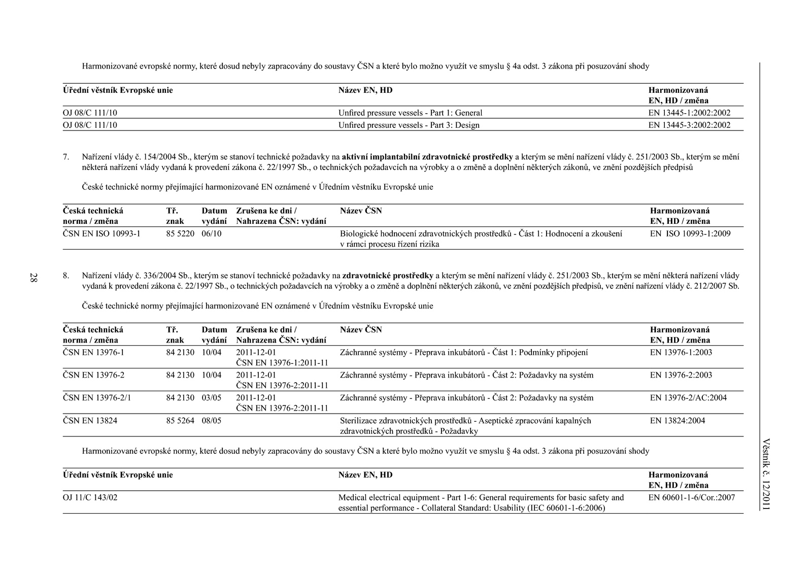 ČÁST A – OZNÁMENÍ Oddíl 1. Harmonizované normy a určené normy ÚNMZ č. 125/11 o harmonizovaných normách ÚNMZ č. 126/11 o určených normách ÚNMZ č. 127/11 o zrušených harmonizovaných normách nebo zrušených harmonizacích platných norem ÚNMZ č. 128/11 o zrušených určených normách nebo zrušených určeních platných norem Oddíl 2. České technické normy ÚNMZ č. 129/11 o vydání ČSN, jejich změn, oprav a zrušení ...