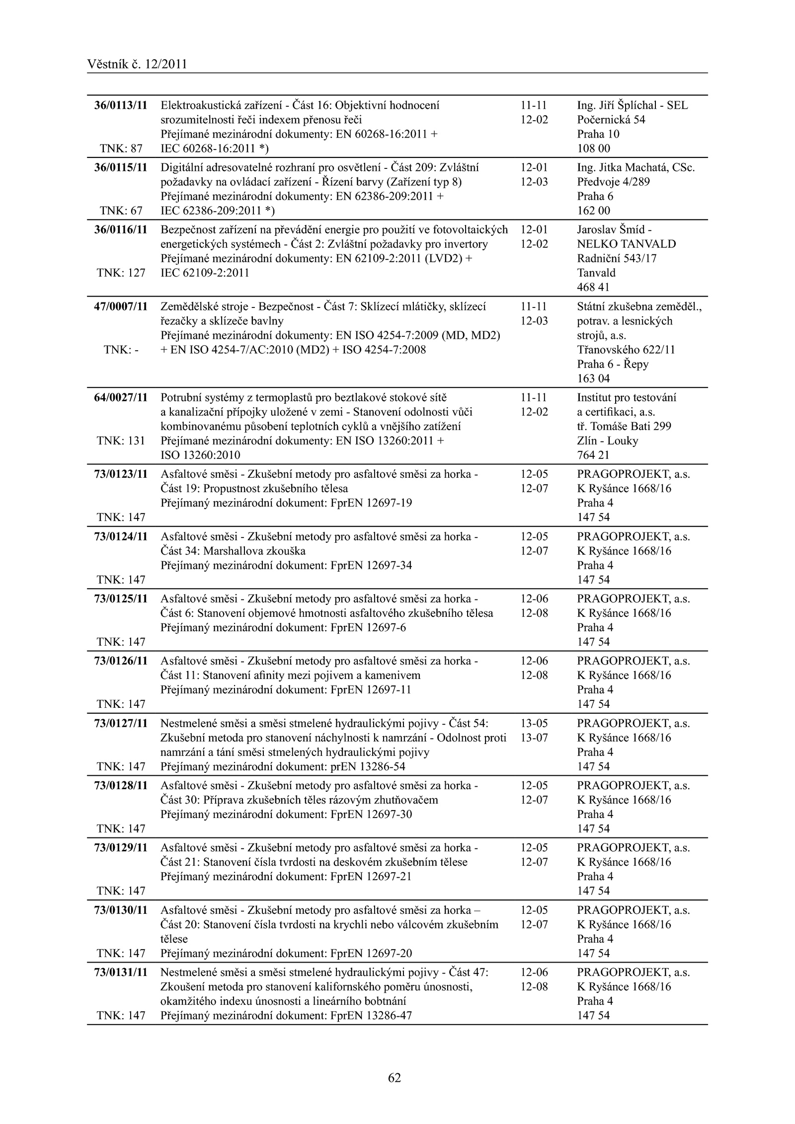 36/0113/11 TNK: 36/0115/11 TNK: 36/0116/11 TNK: 127 47/0007/11 TNK: Elektroakustická zařízení Část 16: Objektivní hodnocení srozumitelnosti řeči indexem přenosu řeči Přejímané mezinárodní dokumenty: 60268-16:2011 IEC 60268-16:2011 Digitální adresovatelné rozhraní pro osvětlení Část 209: Zvláštní požadavky ovládací zařízení Řízení barvy (Zařízení typ Přejímané mezinárodní dokumenty: 62386-209:2011 IEC 62386-209:2011 Bezpečnost zařízení převádění energie pro použití fotovoltaických energetických systémech Část Zvláštní požadavky pro invertory Přejímané mezinárodní dokumenty: 62109-2:2011 (LVD2) IEC 62109-2:2011 Zemědělské stroje Bezpečnost Část Sklízecí mlátičky, sklízecí řezačky a sklízeče bavlny Přejímané mezinárodní dokumenty: ISO 4254-7:2009 (MD, MD2) ISO 4254-7/AC:2010 (MD2) ISO 4254-7:2008 11-11 12-02 Ing. Předvoje 4/289 Praha 162 Jaroslav Šmíd NELKO TANVALD Radniční 543/17 Tanvald 468 Státní zkušebna zeměděl. Tomáše Bati 299 Zlín Louky 764 PRAGOPROJEKT, a.s. Ryšánce 1668/16 Praha 147 PRAGOPROJEKT, a. tř. Ryšánce 1668/16 Praha 147 PRAGOPROJEKT, a.s. Jitka Machatá, CSc. Ryšánce 1668/16 Praha 147 PRAGOPROJEKT, a. Ryšánce 1668/16 Praha 147 PRAGOPROJEKT, a. Ryšánce 1668/16 Praha 147 54