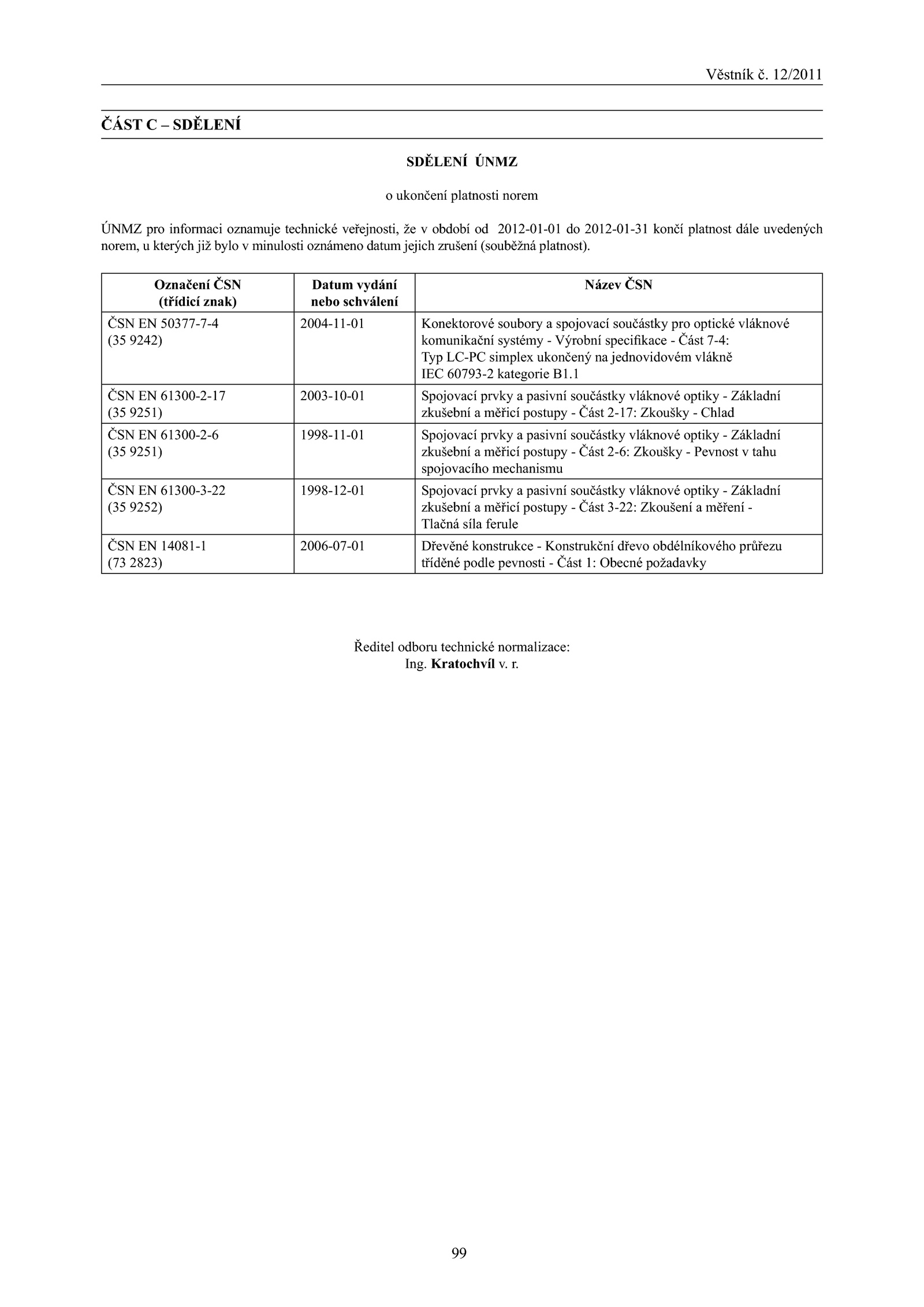 Věstník 12/2011 ČÁST C – SDĚLENÍ SDĚLENÍ ÚNMZ o ukončení platnosti norem ÚNMZ pro informaci oznamuje technické veřejnosti, v období 2012-01-01 2012-01-31 končí platnost dále uvedených norem, kterých již bylo minulosti oznámeno datum jejich zrušení (souběžná platnost). Kratochvíl r.1 Spojovací prvky pasivní součástky vláknové optiky Základní zkušební měřicí postupy Část 2-17: Zkoušky Chlad Spojovací prvky pasivní součástky vláknové optiky Základní zkušební měřicí postupy Část 2-6: Zkoušky Pevnost tahu spojovacího mechanismu Spojovací prvky pasivní součástky vláknové optiky Základní zkušební měřicí postupy Část 3-22: Zkoušení měření Tlačná síla ferule Dřevěné konstrukce Konstrukční dřevo obdélníkového průřezu tříděné podle pevnosti Část Obecné požadavky ČSN 61300-2-17 (35 9251) ČSN 61300-2-6 (35 9251) ČSN 61300-3-22 (35 9252) ČSN 14081-1 (73 2823) 2003-10-01 1998-11-01 1998-12-01 2006-07-01 Ředitel odboru technické normalizace: Ing. 99 . Označení ČSN (třídicí znak) ČSN 50377-7-4 (35 9242) Datum vydání nebo schválení 2004-11-01 Název ČSN Konektorové soubory spojovací součástky pro optické vláknové komunikační systémy Výrobní specifikace Část 7-4: Typ LC-PC simplex ukončený jednovidovém vlákně IEC 60793-2 kategorie B1