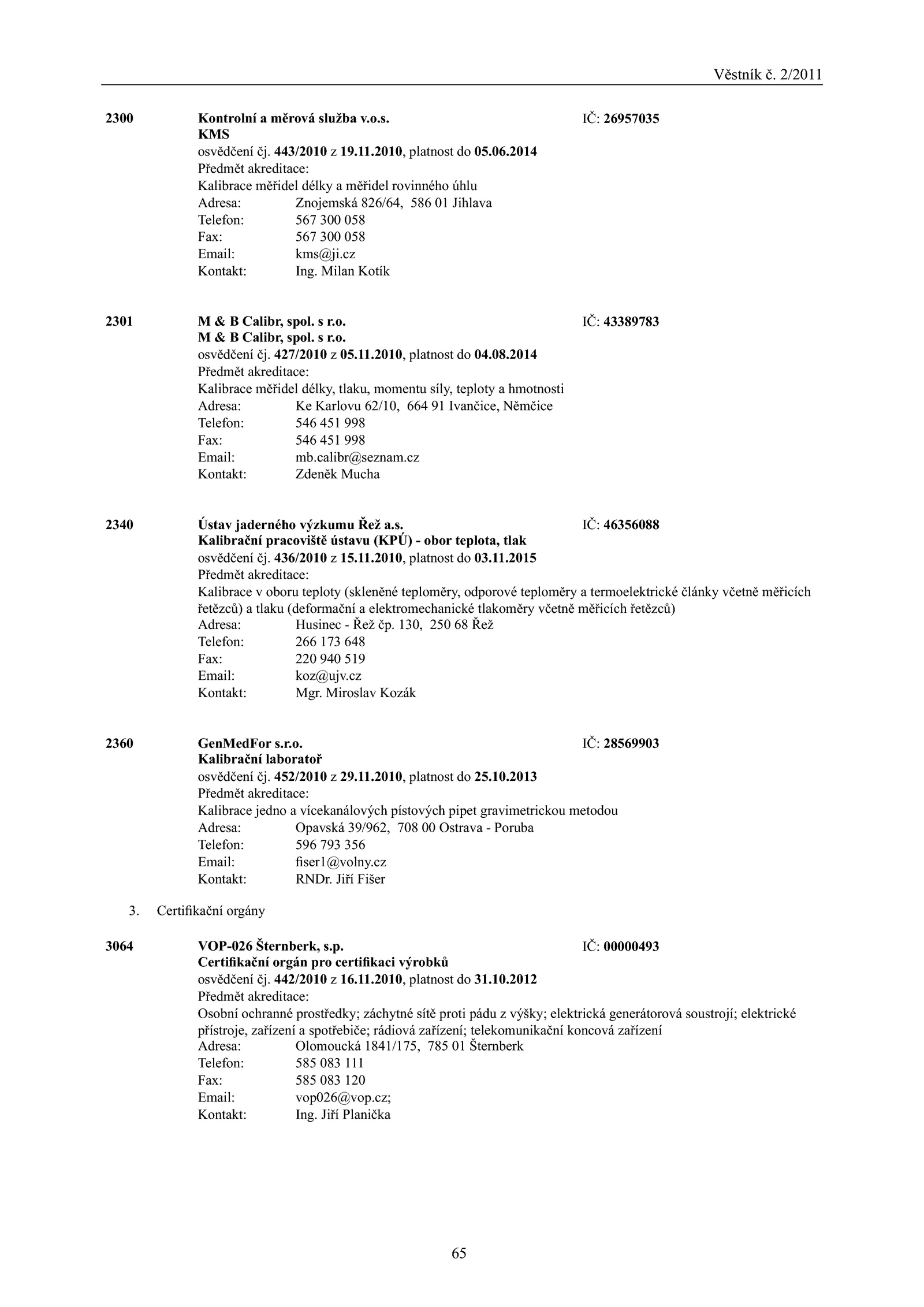 .cz; Kontakt: Ing.2013 Předmět akreditace: Kalibrace jedno a vícekanálových pístových pipet gravimetrickou metodou Adresa: Opavská 39/962, 708 Ostrava Poruba Telefon: 596 793 356 Email: fiser1@volny. 427/2010 z 05.o. IČ: 28569903 Kalibrační laboratoř osvědčení čj. IČ: 00000493 Certifikační orgán pro certifikaci výrobků osvědčení čj.calibr@seznam. Jiří Fišer Certifikační orgány VOP-026 Šternberk, s.o.08.cz Kontakt: Ing.cz Zdeněk Mucha Kontakt: IČ: 26957035