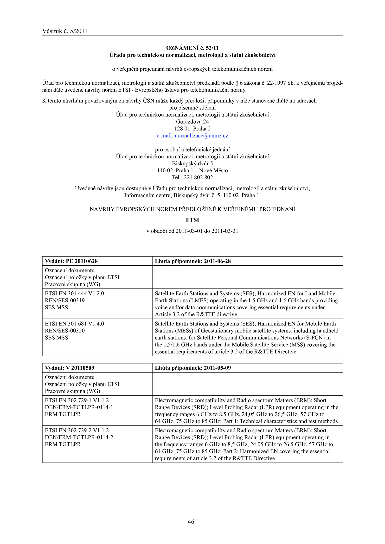 .1. K těmto návrhům považovaným návrhy ČSN může každý předložit připomínky v níže stanovené lhůtě adresách pro písemné sdělení Úřad pro technickou normalizaci, metrologii a státní zkušebnictví Gorazdova 128 Praha e-mail: normalizace@unmz.: 221 802 802 Uvedené návrhy jsou dostupné v Úřadu pro technickou normalizaci, metrologii a státní zkušebnictví, Informačním centru, Biskupský dvůr 110 Praha NÁVRHY EVROPSKÝCH NOREM PŘEDLOŽENÉ K VEŘEJNÉMU PROJEDNÁNÍ ETSI v období 2011-03-01 2011-03-31