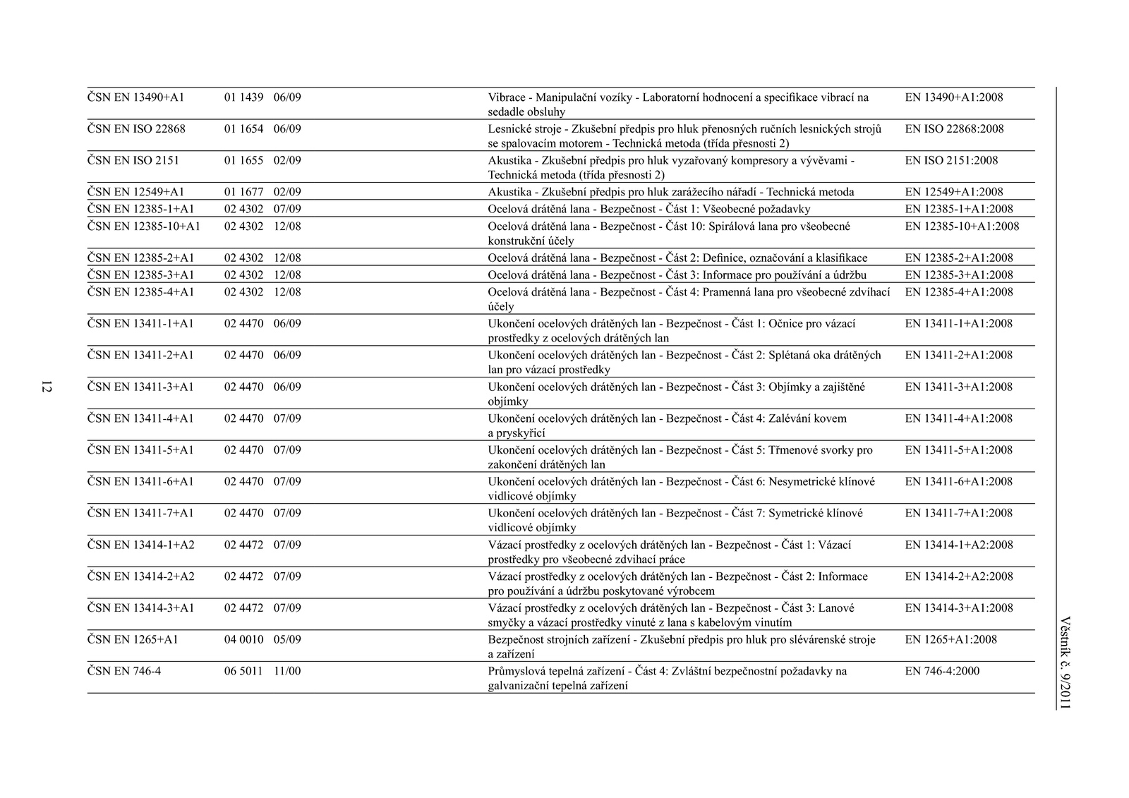Vibrace Manipulační vozíky Laboratorní hodnocení a specifikace vibrací sedadle obsluhy Lesnické stroje Zkušební předpis pro hluk přenosných ručních lesnických strojů spalovacím motorem Technická metoda (třída přesnosti Akustika Zkušební předpis pro hluk vyzařovaný kompresory a vývěvami Technická metoda (třída přesnosti Akustika Zkušební předpis pro hluk zarážecího nářadí Technická metoda Ocelová drátěná lana Bezpečnost Část Všeobecné požadavky Ocelová drátěná lana Bezpečnost Část 10: Spirálová lana pro všeobecné konstrukční účely Ocelová drátěná lana Bezpečnost Část Definice, označování a klasifikace Ocelová drátěná lana Bezpečnost Část Informace pro používání a údržbu Ocelová drátěná lana Bezpečnost Část Pramenná lana pro všeobecné zdvíhací účely Ukončení ocelových drátěných lan Bezpečnost Část Očnice pro vázací prostředky z ocelových drátěných lan Ukončení ocelových drátěných lan Bezpečnost Část Splétaná oka drátěných lan pro vázací prostředky Ukončení ocelových drátěných lan Bezpečnost Část Objímky a zajištěné objímky Ukončení ocelových drátěných lan Bezpečnost Část Zalévání kovem a pryskyřicí Ukončení ocelových drátěných lan Bezpečnost Část Třmenové svorky pro zakončení drátěných lan Ukončení ocelových drátěných lan Bezpečnost Část Nesymetrické klínové vidlicové objímky Ukončení ocelových drátěných lan Bezpečnost Část Symetrické klínové vidlicové objímky Vázací prostředky z ocelových drátěných lan Bezpečnost Část Vázací prostředky pro všeobecné zdvihací práce Vázací prostředky z ocelových drátěných lan Bezpečnost Část Informace pro používání a údržbu poskytované výrobcem Vázací prostředky z ocelových drátěných lan Bezpečnost Část Lanové smyčky a vázací prostředky vinuté z lana s kabelovým vinutím Bezpečnost strojních zařízení Zkušební předpis pro hluk pro slévárenské stroje a zařízení Průmyslová tepelná zařízení Část Zvláštní bezpečnostní požadavky galvanizační tepelná zařízení