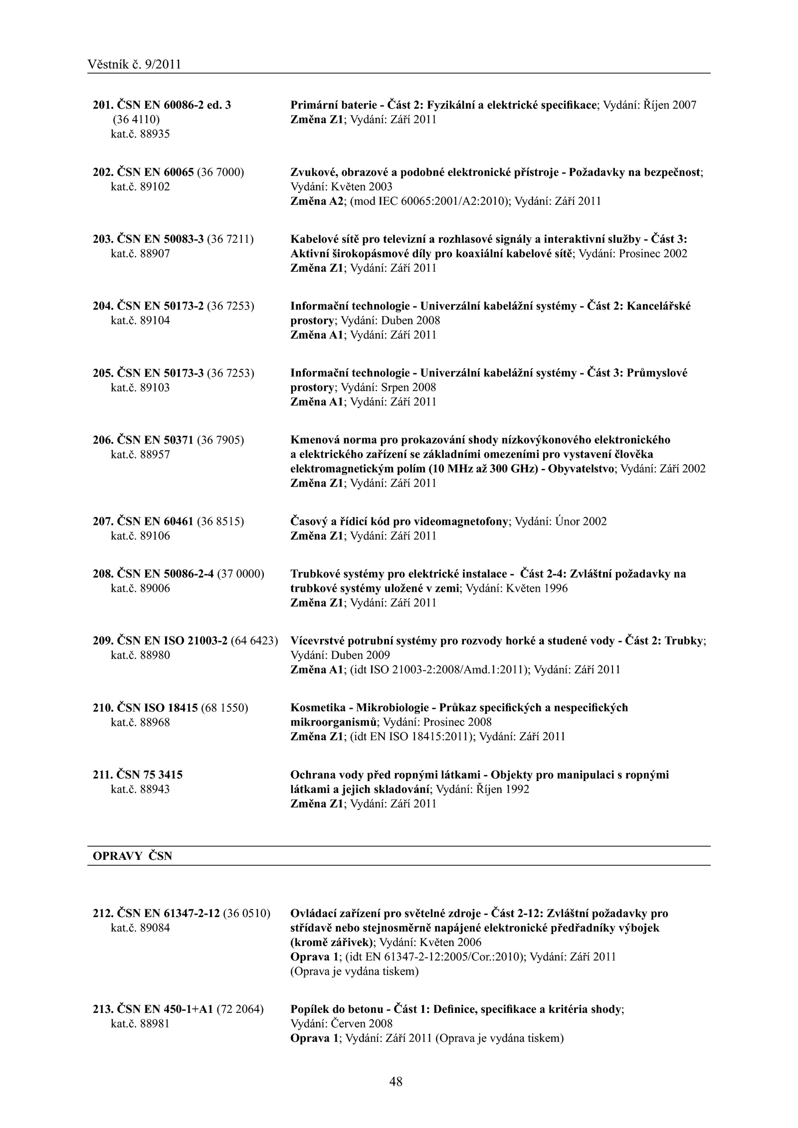 Zvukové, obrazové a podobné elektronické přístroje Požadavky bezpečnost; Vydání: Květen 2003 Změna A2; (mod IEC 60065:2001/A2:2010); Vydání: Září 2011 Kabelové sítě pro televizní a rozhlasové signály a interaktivní služby Část Aktivní širokopásmové díly pro koaxiální kabelové sítě; Vydání: Prosinec 2002 Změna Z1; Vydání: Září 2011 Informační technologie Univerzální kabelážní systémy Část Kancelářské prostory; Vydání: Duben 2008 Změna A1; Vydání: Září 2011 Informační technologie Univerzální kabelážní systémy Část Průmyslové prostory; Vydání: Srpen 2008 Změna A1; Vydání: Září 2011 Kmenová norma pro prokazování shody nízkovýkonového elektronického a elektrického zařízení základními omezeními pro vystavení člověka elektromagnetickým polím (10 MHz 300 GHz) Obyvatelstvo; Vydání: Září 2002 Změna Z1; Vydání: Září 2011 Časový a řídicí kód pro videomagnetofony; Vydání: Únor 2002 Změna Z1; Vydání: Září 2011 Trubkové systémy pro elektrické instalace Část 2-4: Zvláštní požadavky trubkové systémy uložené v zemi; Vydání: Květen 1996 Změna Z1; Vydání: Září 2011 Vícevrstvé potrubní systémy pro rozvody horké a studené vody Část Trubky; Vydání: Duben 2009 Změna A1; (idt ISO 21003-2:2008/Amd. ČSN 3415 kat. (36 4110) kat.č.č. ČSN 61347-2-12 (36 0510) kat. ČSN ISO 21003-2 (64 6423) kat. 89006