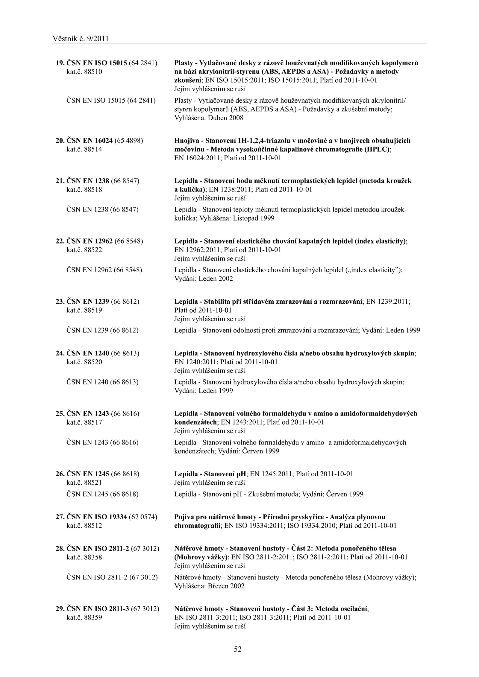 29. 88510 Plasty Vytlačované desky z rázově houževnatých modifikovaných kopolymerů bázi akrylonitril-styrenu (ABS, AEPDS a ASA) Požadavky a metody zkoušení; ISO 15015:2011; ISO 15015:2011; Platí 2011-10-01 Jejím vyhlášením ruší Plasty Vytlačované desky z rázově houževnatých modifikovaných akrylonitril/ styren kopolymerů (ABS, AEPDS a ASA) Požadavky a zkušební metody; Vyhlášena: Duben 2008 Hnojiva Stanovení 1H-1,2,4-triazolu v močovině a v hnojivech obsahujících močovinu Metoda vysokoúčinné kapalinové chromatografie (HPLC); 16024:2011; Platí 2011-10-01 Lepidla Stanovení bodu měknutí termoplastických lepidel (metoda kroužek a kulička); 1238:2011; Platí 2011-10-01 Jejím vyhlášením ruší Lepidla Stanovení teploty měknutí termoplastických lepidel metodou kroužekkulička; Vyhlášena: Listopad 1999 Lepidla Stanovení elastického chování kapalných lepidel (index elasticity); 12962:2011; Platí 2011-10-01 Jejím vyhlášením ruší Lepidla Stanovení elastického chování kapalných lepidel („index elasticity”); Vydání: Leden 2002 Lepidla Stabilita při střídavém zmrazování a rozmrazování; 1239:2011; Platí 2011-10-01 Jejím vyhlášením ruší Lepidla Stanovení odolnosti proti zmrazování a rozmrazování; Vydání: Leden 1999 Lepidla Stanovení hydroxylového čísla a/nebo obsahu hydroxylových skupin; 1240:2011; Platí 2011-10-01 Jejím vyhlášením ruší Lepidla Stanovení hydroxylového čísla a/nebo obsahu hydroxylových skupin; Vydání: Leden 1999 Lepidla Stanovení volného formaldehydu v amino a amidoformaldehydových kondenzátech; 1243:2011; Platí 2011-10-01 Jejím vyhlášením ruší Lepidla Stanovení volného formaldehydu v amino- a amidoformaldehydových kondenzátech; Vydání: Červen 1999 Lepidla Stanovení pH; 1245:2011; Platí 2011-10-01 Jejím vyhlášením ruší Lepidla Stanovení Zkušební metoda; Vydání: Červen 1999 Pojiva pro nátěrové hmoty Přírodní pryskyřice Analýza plynovou chromatografií; ISO 19334:2011; ISO 19334:2010; Platí 2011-10-01 Nátěrové hmoty Stanovení hustoty Část Metoda ponořeného tělesa (Mohrovy vážky); ISO 2811-2:2011; ISO 2811-2:2011; Platí 2011-10-01 Jejím vyhlášením ruší Nátěrové hmoty Stanovení hustoty Metoda ponořeného tělesa (Mohrovy vážky); Vyhlášena: Březen 2002 Nátěrové hmoty Stanovení hustoty Část Metoda oscilační; ISO 2811-3:2011; ISO 2811-3:2011; Platí 2011-10-01 Jejím vyhlášením ruší
