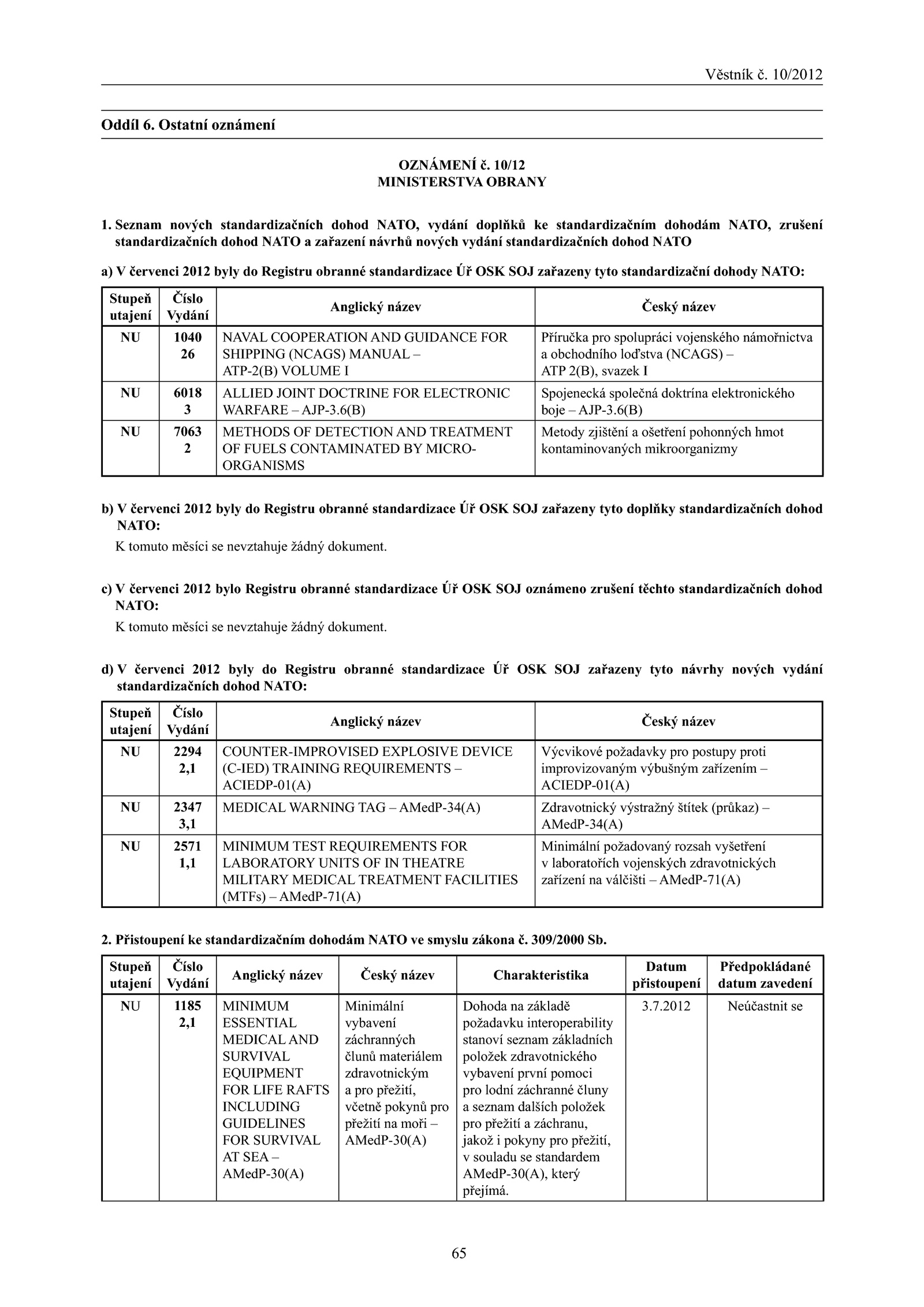 1. Seznam nových standardizačních dohod NATO, vydání doplňků standardizačním dohodám NATO, zrušení