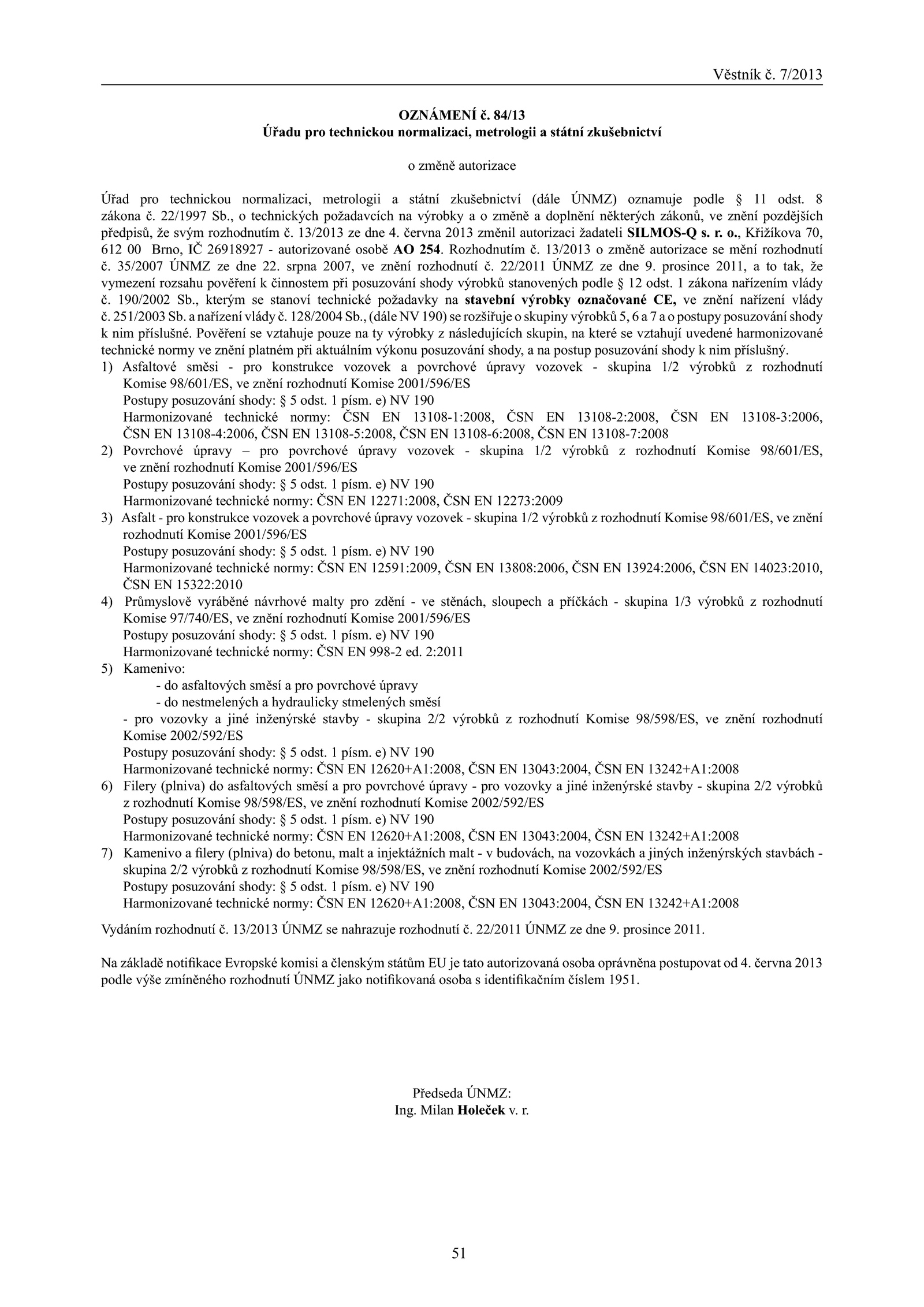 předpisů, svým rozhodnutím 13/2013 dne června 2013 změnil autorizaci žadateli SILMOS-Q o. písm. 190