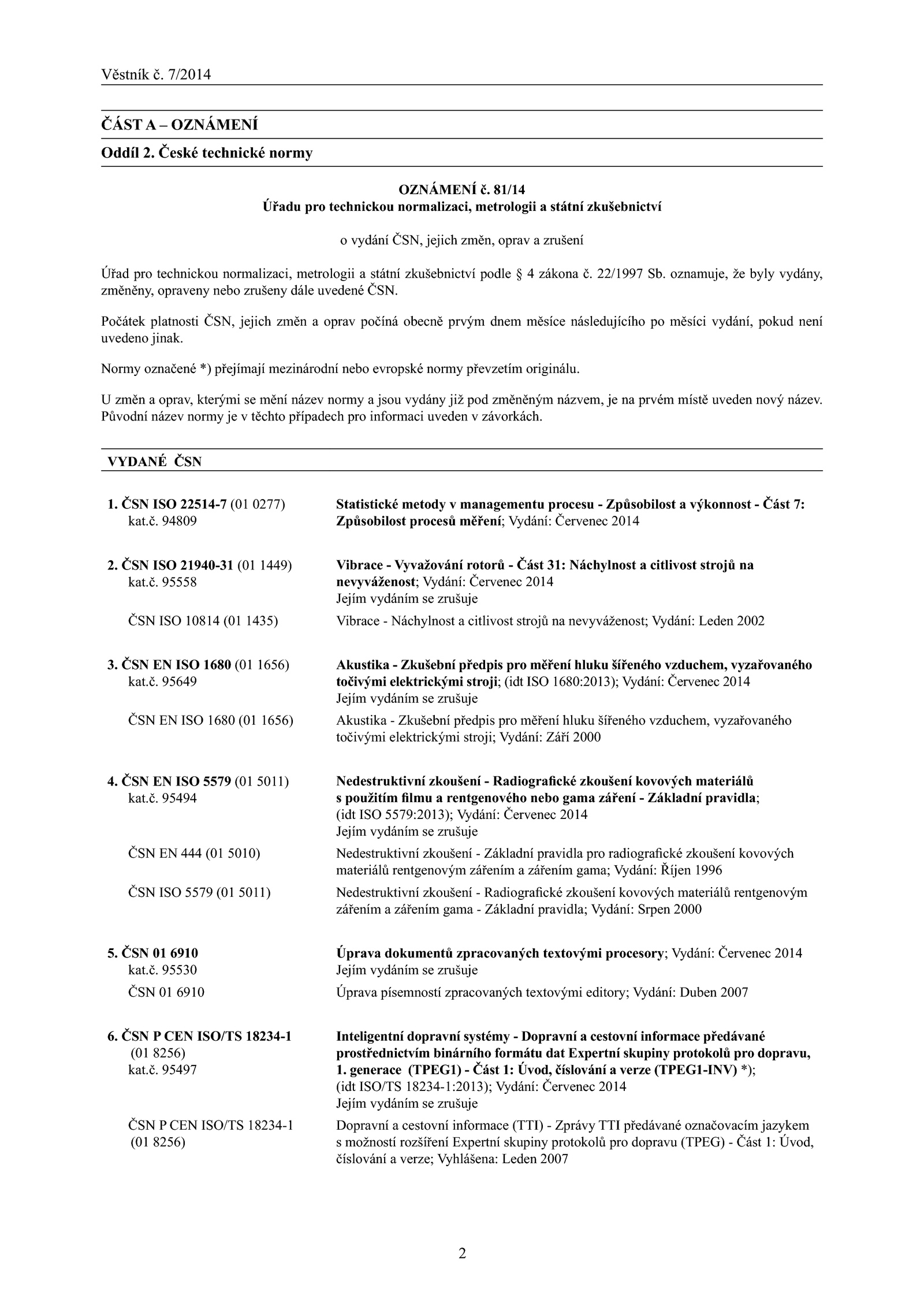 o vydání ČSN, jejich změn, oprav a zrušení