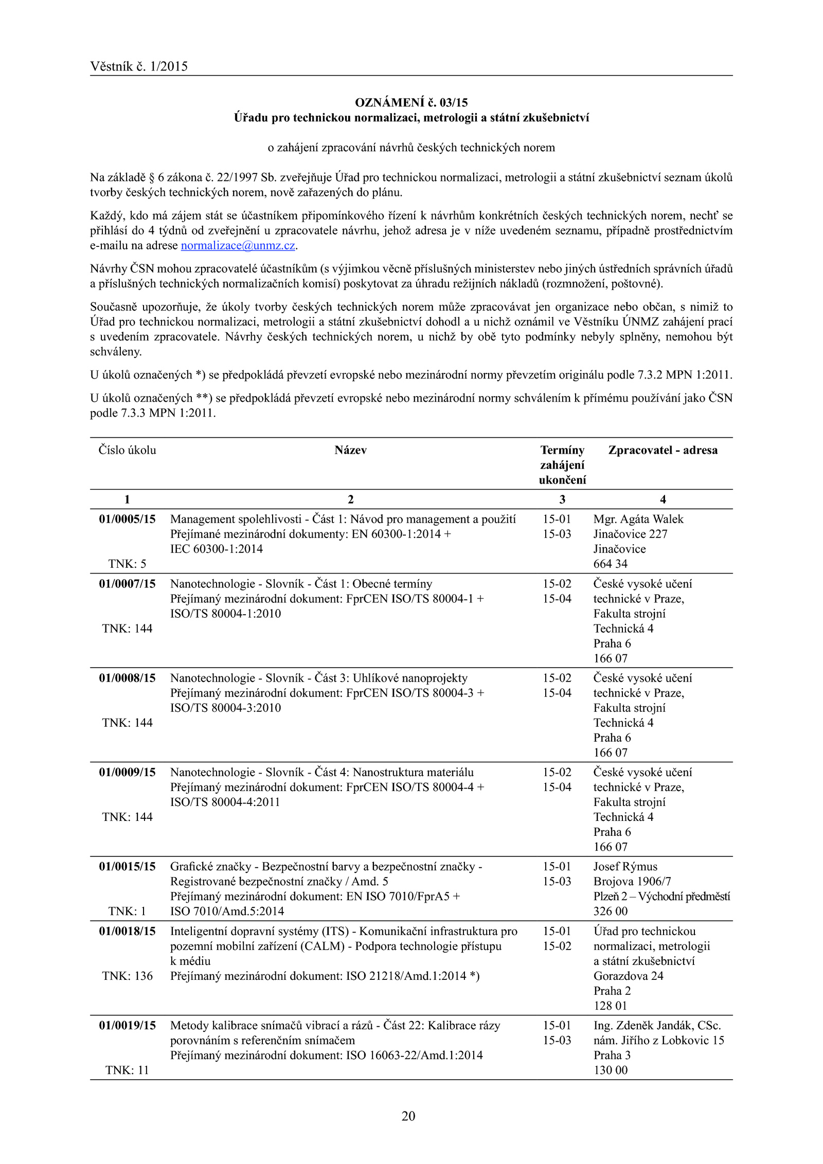 Úřad pro technickou normalizaci, metrologii státní zkušebnictví dohodl nichž oznámil Věstníku ÚNMZ zahájení prací