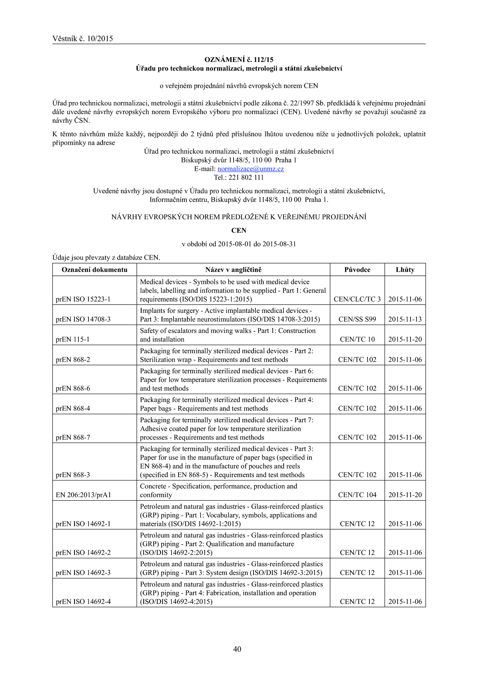 dále uvedené návrhy evropských norem Evropského výboru pro normalizaci (CEN).Věstník 10/2015