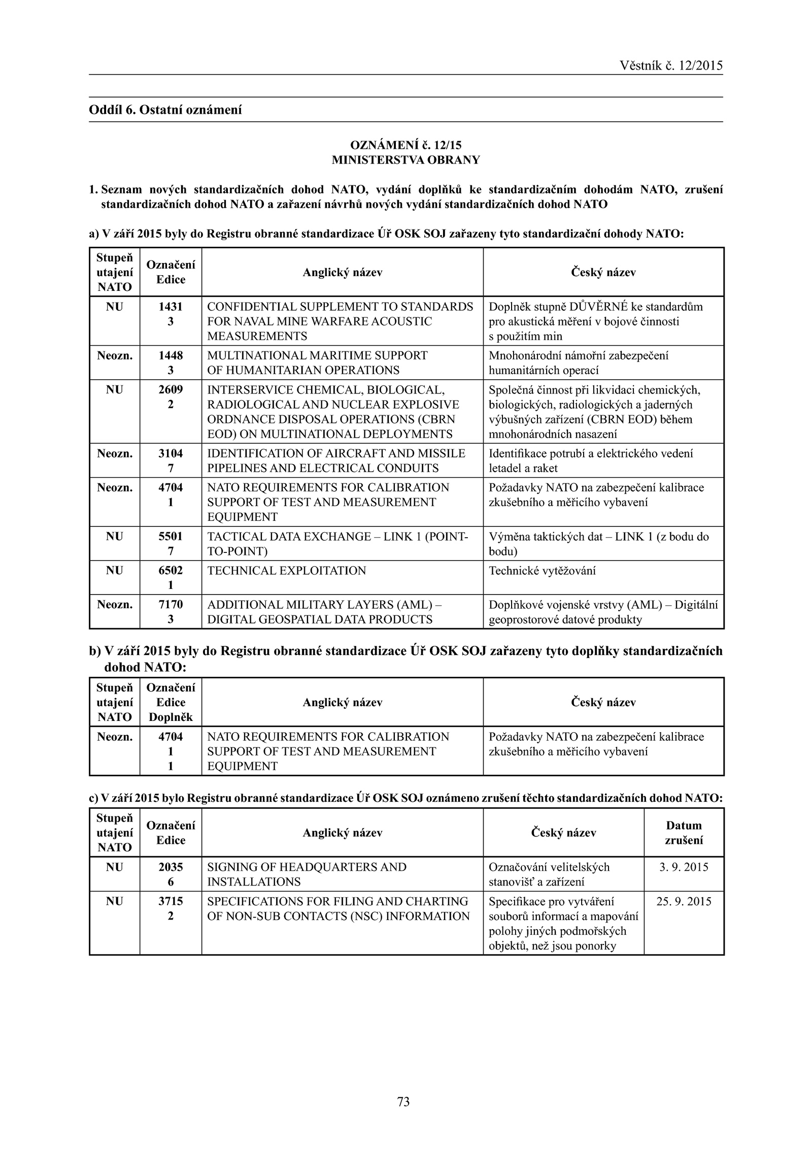 c) V září 2015 bylo Registru obranné standardizace OSK SOJ oznámeno zrušení těchto standardizačních dohod NATO: