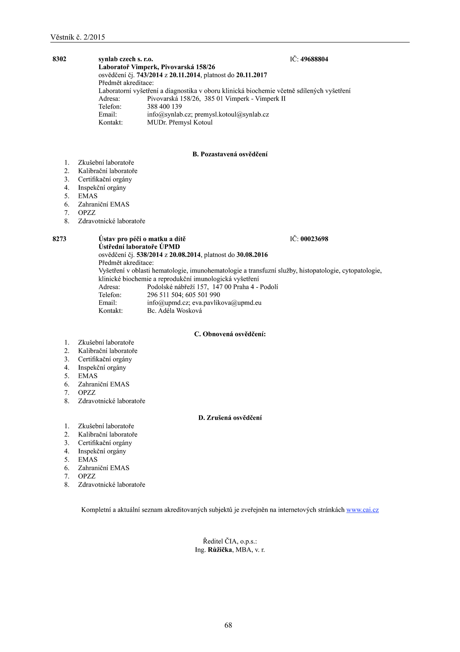 Kontakt: MUDr.08.2014, platnost 30. Certifikační orgány