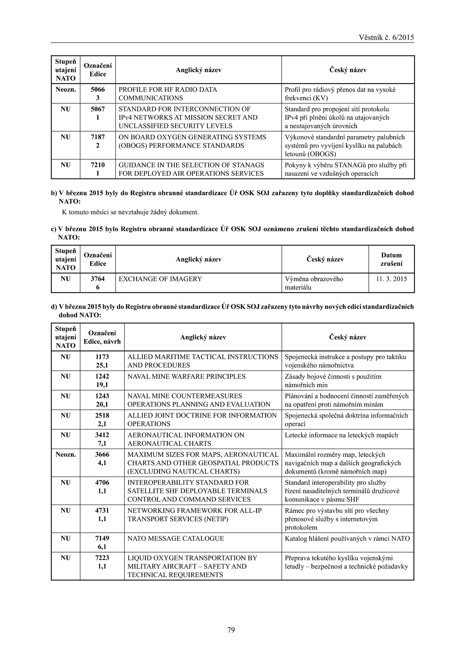 d) V březnu 2015 byly Registru obranné standardizace OSK SOJ zařazeny tyto návrhy nových edicí standardizačních