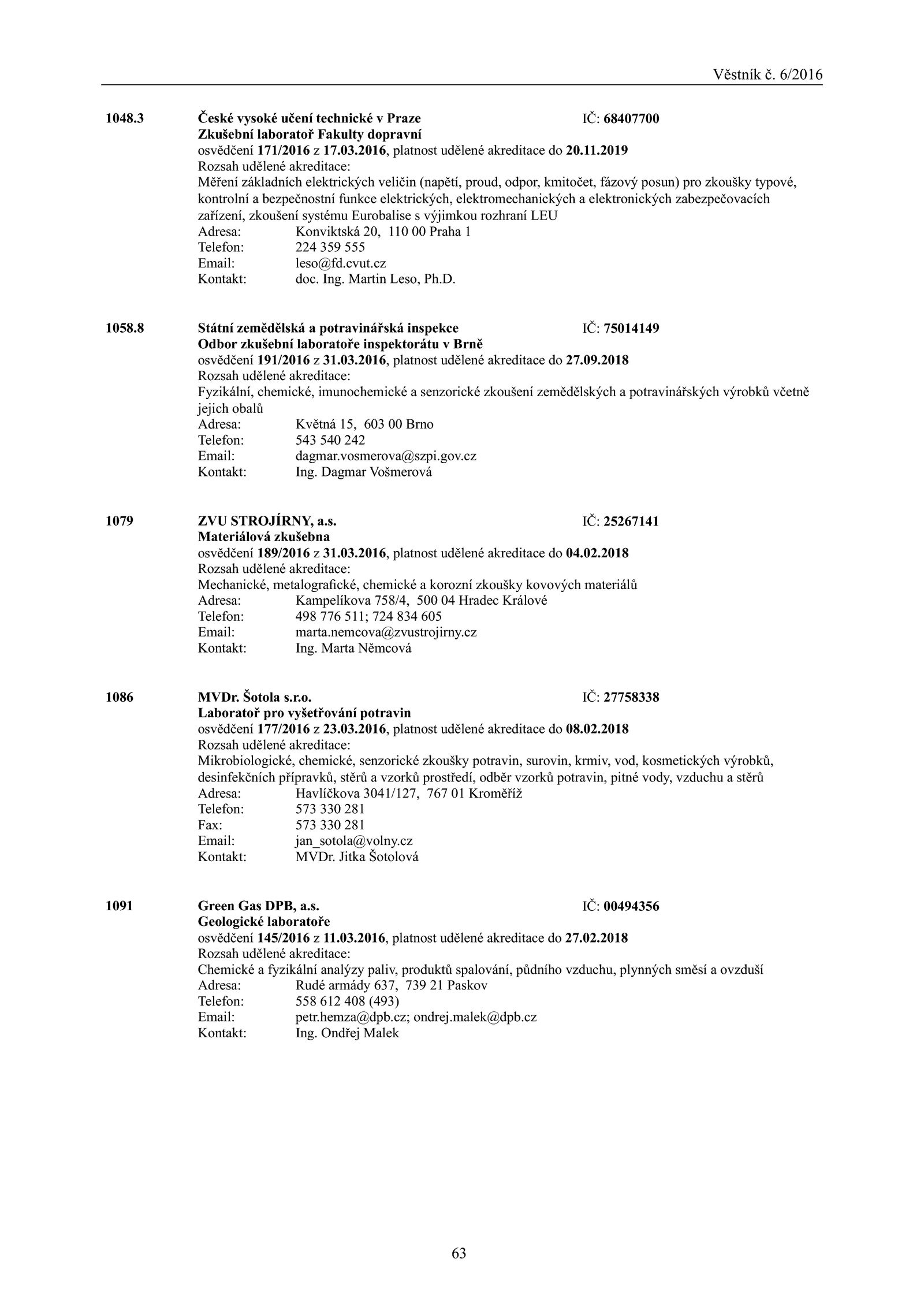 osvědčení 189/2016 z 31.2016, platnost udělené akreditace 27.2016, platnost udělené akreditace 04.Věstník 6/2016