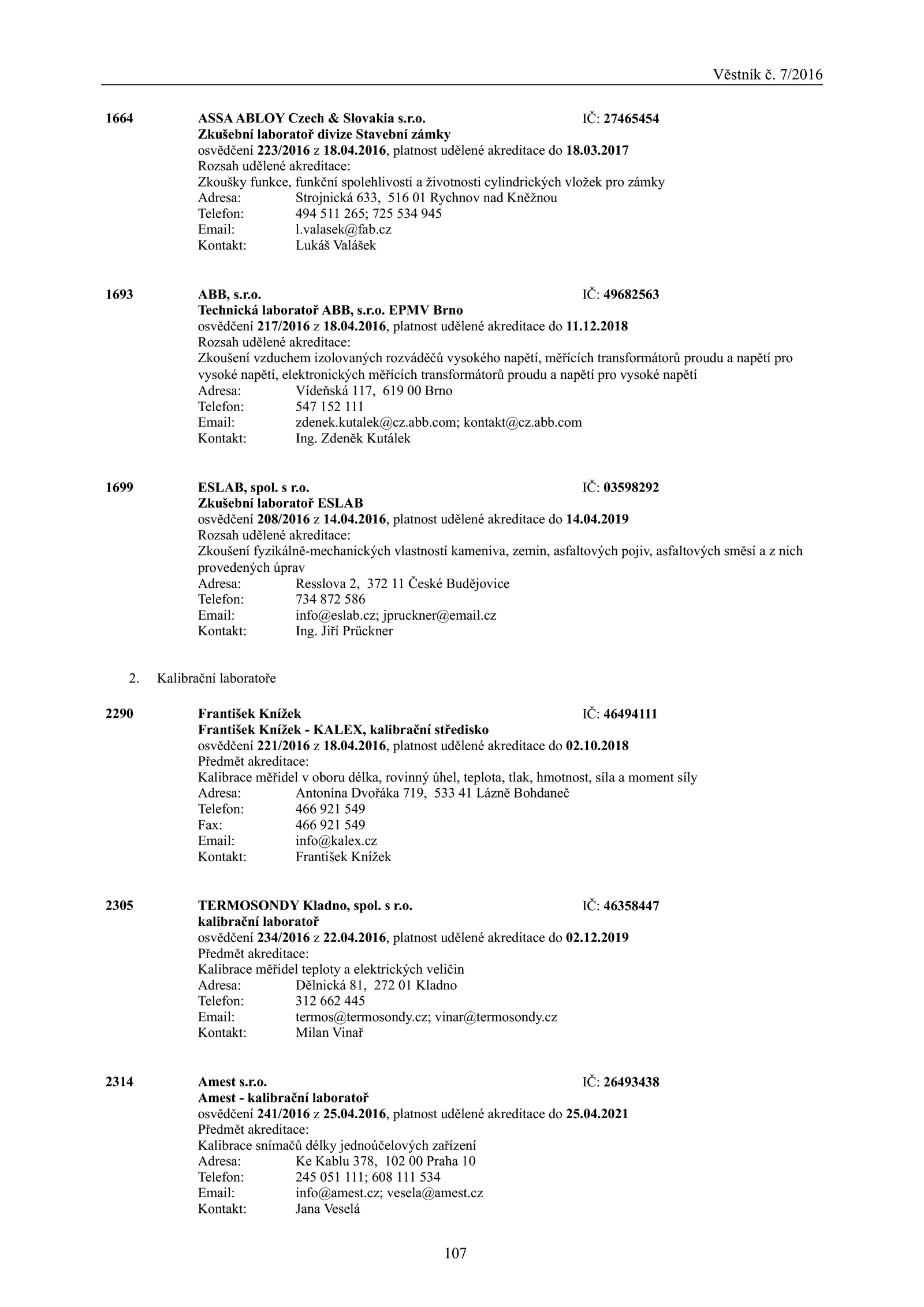 osvědčení 241/2016 z 25.2016, platnost udělené akreditace 18.Věstník 7/2016