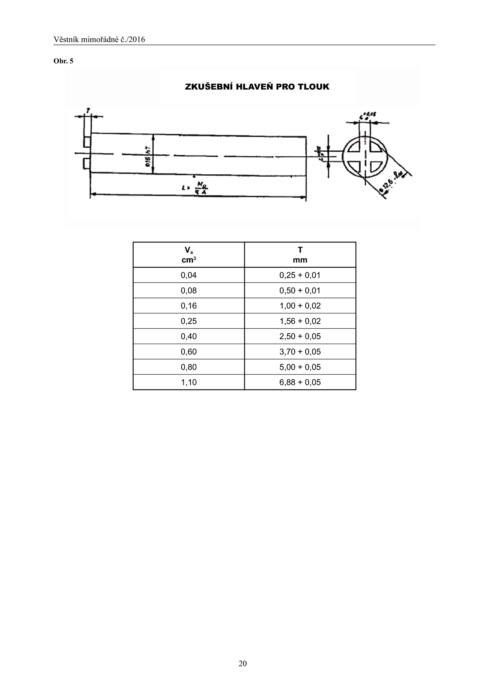 /2016 20 Obr.Věstník mimořádné č. 5 Va cm3 T mm 0,04 0,25 0,01 0,08 0,50 0,01 0,16 1,00 0,02 0,25 1,56 0,02 0,40 2,50 0,05 0,60 3,70 0,05 0,80 5,00 0,05 1,10 6,88 0,05 Zkušební hlaveň pro tlouk