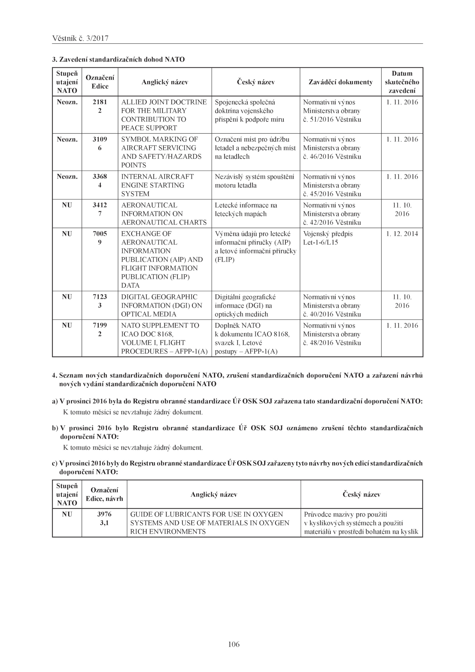 a) V prosinci 2016 byla Registru obranné standardizace OSK SOJ zařazena tato standardizační doporučení NATO: