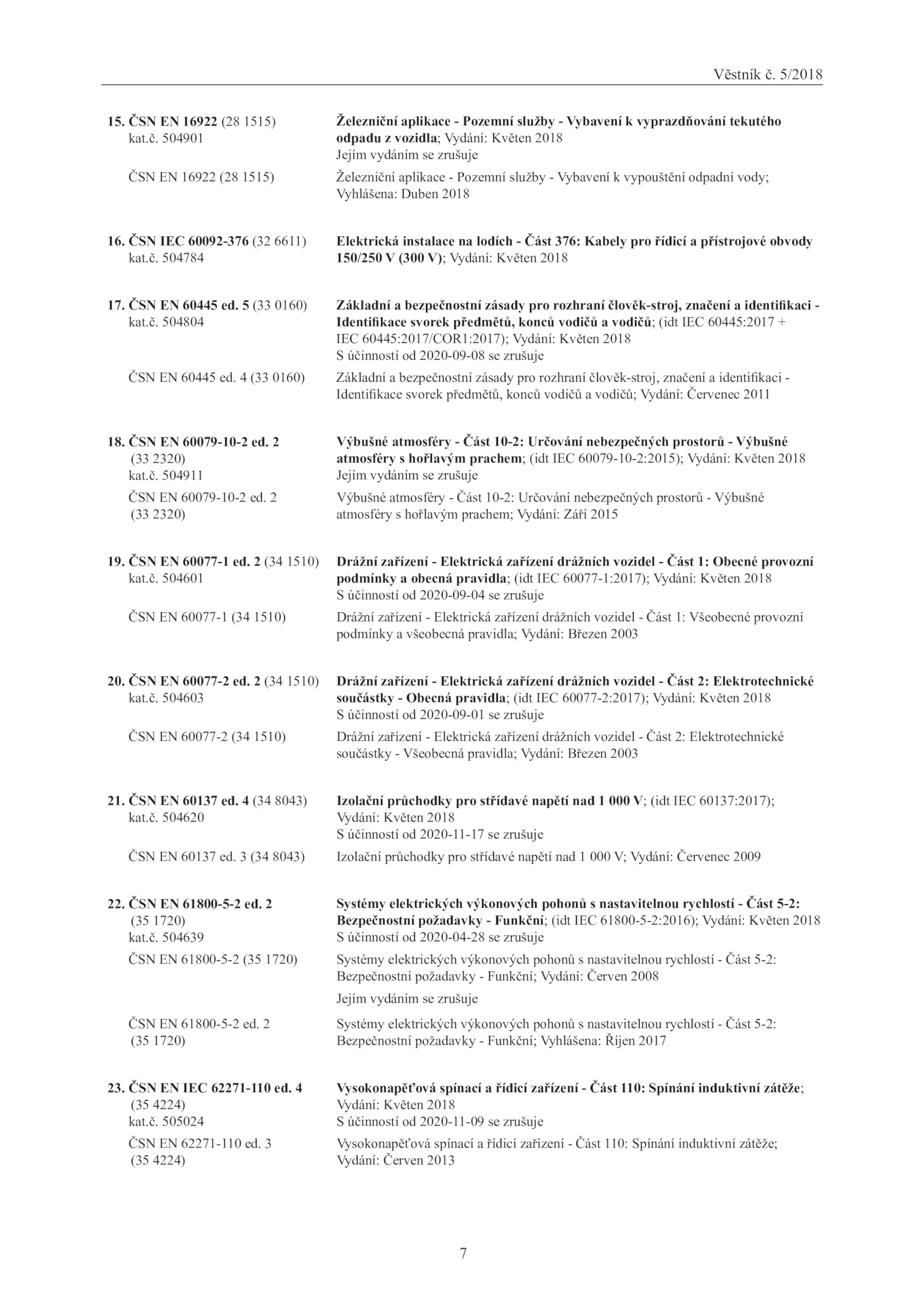 ČSN 60137 ed.č. (34 1510) kat.č. (33 0160) Základní bezpečnostní zásady pro rozhraní člověk-stroj, značení identifikaci - Identifikace svorek předmětů, konců vodičů vodičů; Vydání: Červenec 2011 18. ČSN 60077-1 ed. 504620 Izolační průchodky pro střídavé napětí nad 000 (idt IEC 60137:2017); Vydání: Květen 2018 S účinností 2020-11-17 zrušuje ČSN 60137 ed. 3 (35 4224) Vysokonapěťová spínací řídicí zařízení Část 110: Spínání induktivní zátěže; Vydání: Červen 2013 .Věstník 5/2018 7 15. ČSN 60079-10-2 ed. 504911 Výbušné atmosféry Část 10-2: Určování nebezpečných prostorů Výbušné atmosféry hořlavým prachem; (idt IEC 60079-10-2:2015); Vydání: Květen 2018 Jejím vydáním zrušuje ČSN 60079-10-2 ed. 2 (35 1720) Systémy elektrických výkonových pohonů nastavitelnou rychlostí Část 5-2: Bezpečnostní požadavky Funkční; Vyhlášena: Říjen 2017 23. ČSN 60077-2 ed.č.č. 504601 Drážní zařízení Elektrická zařízení drážních vozidel Část Obecné provozní podmínky obecná pravidla; (idt IEC 60077-1:2017); Vydání: Květen 2018 S účinností 2020-09-04 zrušuje ČSN 60077-1 (34 1510) Drážní zařízení Elektrická zařízení drážních vozidel Část Všeobecné provozní podmínky všeobecná pravidla; Vydání: Březen 2003 20. (33 0160) kat. 504603 Drážní zařízení Elektrická zařízení drážních vozidel Část Elektrotechnické součástky Obecná pravidla; (idt IEC 60077-2:2017); Vydání: Květen 2018 S účinností 2020-09-01 zrušuje ČSN 60077-2 (34 1510) Drážní zařízení Elektrická zařízení drážních vozidel Část Elektrotechnické součástky Všeobecná pravidla; Vydání: Březen 2003 21. ČSN IEC 60092-376 (32 6611) kat. (34 8043) kat. (34 1510) kat. ČSN 61800-5-2 ed.č. ČSN IEC 62271-110 ed.č. 504639 Systémy elektrických výkonových pohonů nastavitelnou rychlostí Část 5-2: Bezpečnostní požadavky Funkční; (idt IEC 61800-5-2:2016); Vydání: Květen 2018 S účinností 2020-04-28 zrušuje ČSN 61800-5-2 (35 1720) Systémy elektrických výkonových pohonů nastavitelnou rychlostí Část 5-2: Bezpečnostní požadavky Funkční; Vydání: Červen 2008 Jejím vydáním zrušuje ČSN 61800-5-2 ed.č. (34 8043) Izolační průchodky pro střídavé napětí nad 000 Vydání: Červenec 2009 22. 504804 Základní bezpečnostní zásady pro rozhraní člověk-stroj, značení identifikaci - Identifikace svorek předmětů, konců vodičů vodičů; (idt IEC 60445:2017 + IEC 60445:2017/COR1:2017); Vydání: Květen 2018 S účinností 2020-09-08 zrušuje ČSN 60445 ed. 504901 Železniční aplikace Pozemní služby Vybavení vyprazdňování tekutého odpadu vozidla; Vydání: Květen 2018 Jejím vydáním zrušuje ČSN 16922 (28 1515) Železniční aplikace Pozemní služby Vybavení vypouštění odpadní vody; Vyhlášena: Duben 2018 16. 2 (33 2320) Výbušné atmosféry Část 10-2: Určování nebezpečných prostorů Výbušné atmosféry hořlavým prachem; Vydání: Září 2015 19.č. 504784 Elektrická instalace lodích Část 376: Kabely pro řídicí přístrojové obvody 150/250 (300 V); Vydání: Květen 2018 17.č. 2 (33 2320) kat. ČSN 16922 (28 1515) kat. 2 (35 1720) kat. 4 (35 4224) kat. ČSN 60445 ed. 505024 Vysokonapěťová spínací řídicí zařízení Část 110: Spínání induktivní zátěže; Vydání: Květen 2018 S účinností 2020-11-09 zrušuje ČSN 62271-110 ed