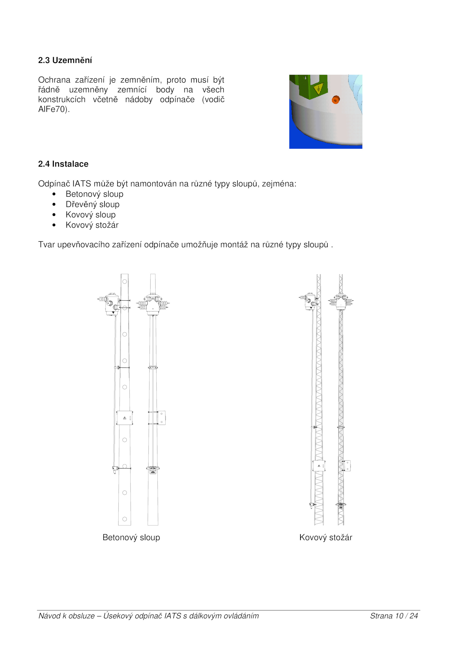 Tvar upevňovacího zařízení odpínače umožňuje montáž různé typy sloupů .3 Uzemnění