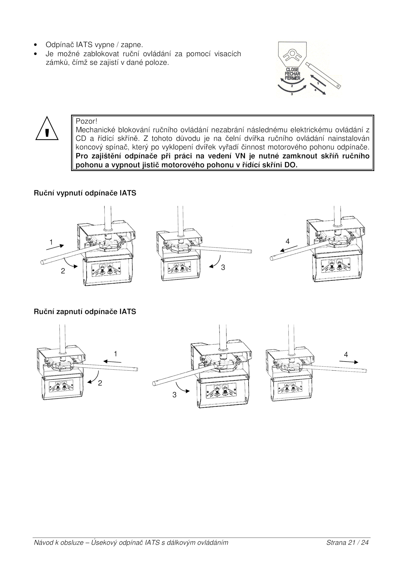 Návod obsluze Úsekový odpínač IATS dálkovým ovládáním Strana 24 ! • Odpínač IATS vypne zapne. • možné zablokovat ruční ovládání pomocí visacích zámků, čímž zajistí dané poloze. tohoto důvodu čelní dvířka ručního ovládání nainstalován koncový spínač, který vyklopení dvířek vyřadí činnost motorového pohonu odpínače. Ruční vypnutí odpínače IATS Ruční zapnutí odpínače IATS 1 2 4 3 1 2 4 3 . Pozor! Mechanické blokování ručního ovládání nezabrání následnému elektrickému ovládání z CD řídící skříně. Pro zajištění odpínače při práci vedení nutné zamknout skříň ručního pohonu vypnout jistič motorového pohonu řídící skříni DO