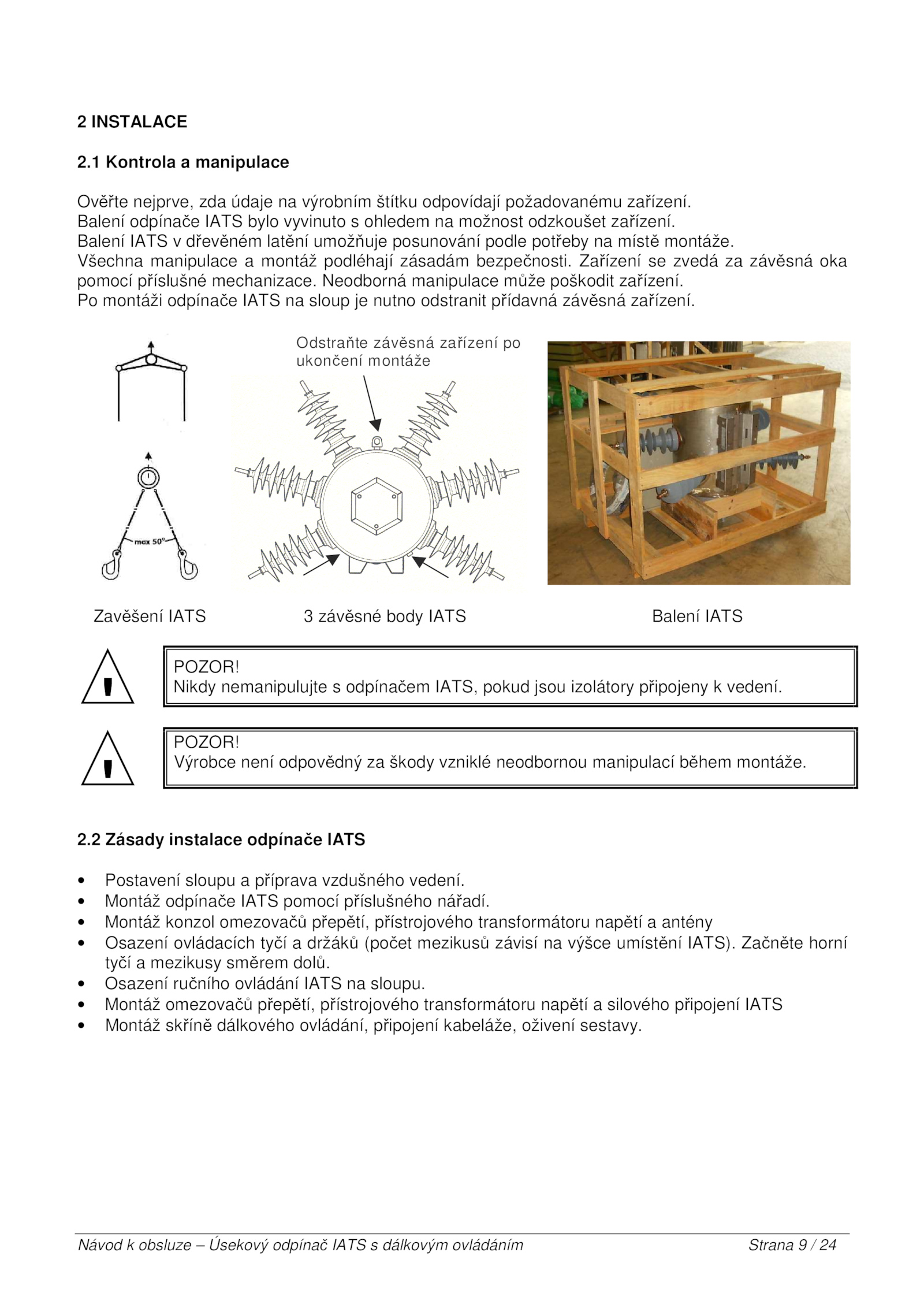 Nikdy nemanipulujte odpínačem IATS, pokud jsou izolátory připojeny vedení.2 Zásady instalace odpínače IATS