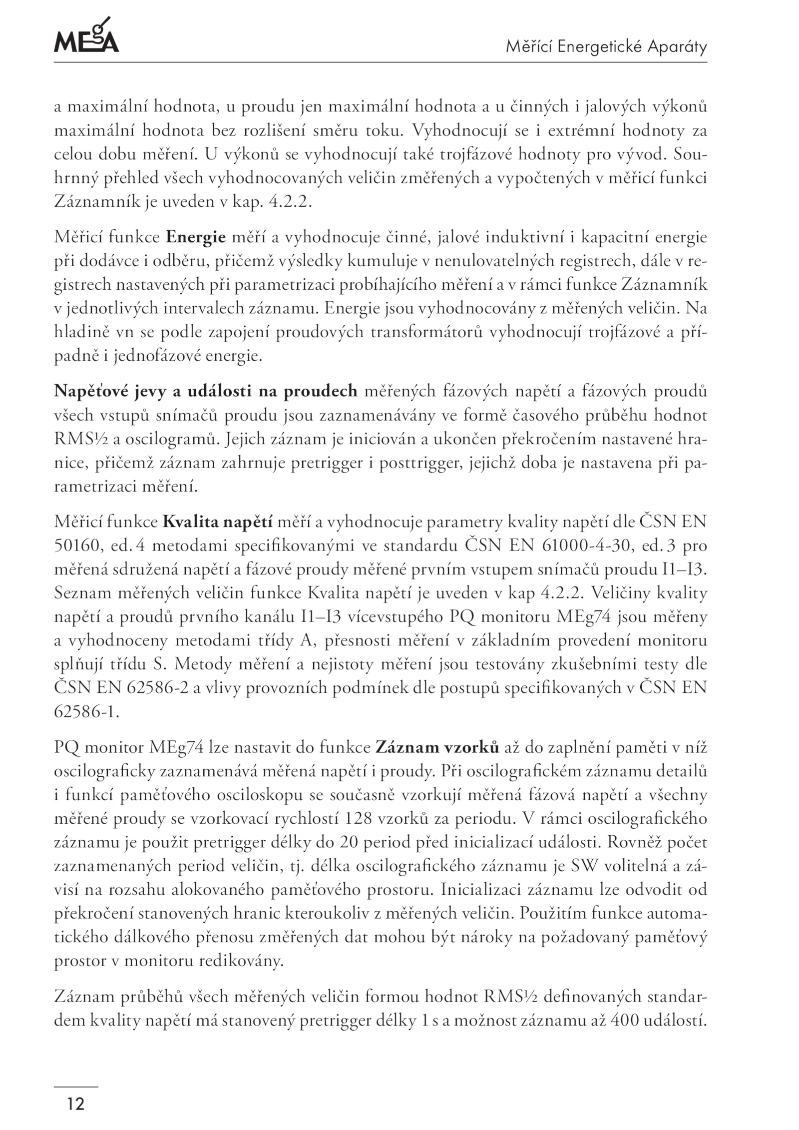 celou dobu měření.4 metodami specifikovanými standardu ČSN 61000-4-30, ed.2. délka oscilografického záznamu volitelná zá-