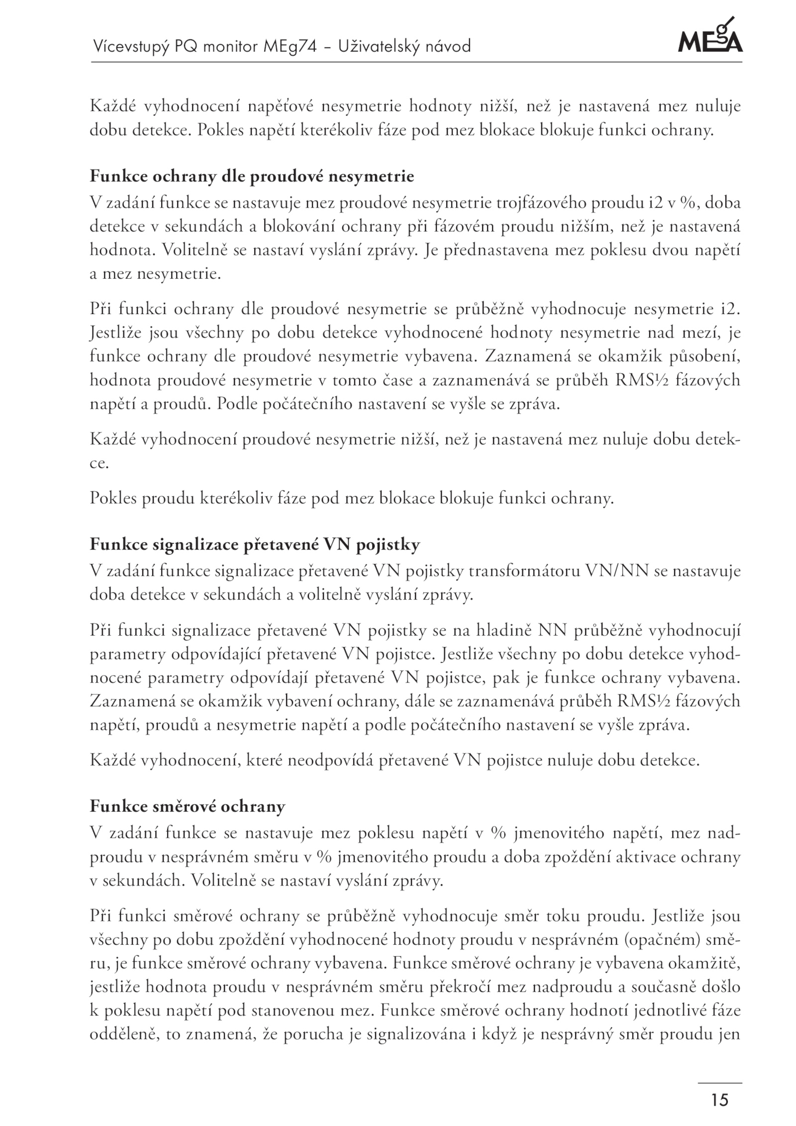 napětí, proudů nesymetrie napětí podle počátečního nastavení vyšle zpráva. Pokles napětí kterékoliv fáze pod mez blokace blokuje funkci ochrany.