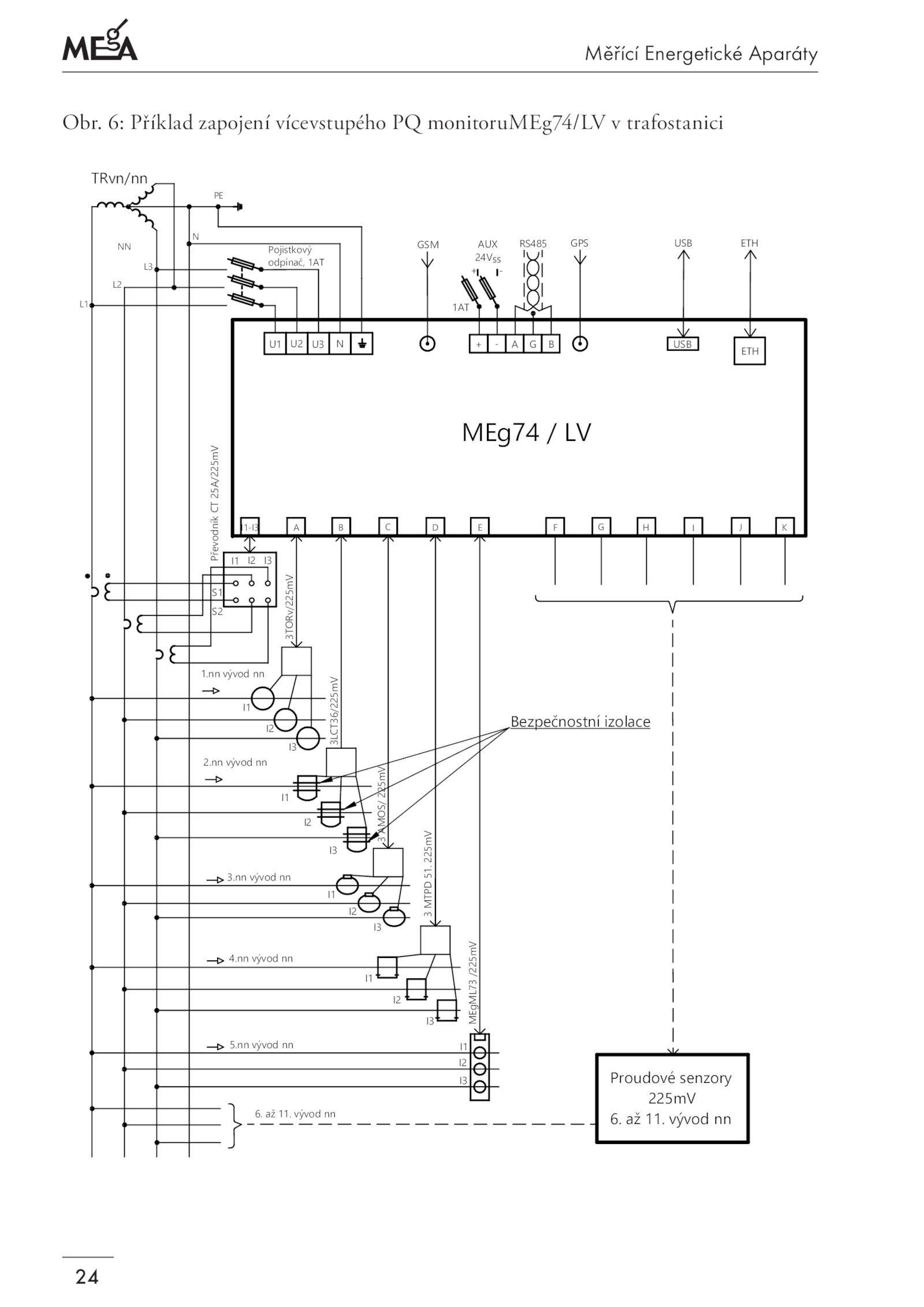 vývod nn USB ETH AUX 1AT .nn vývod nn 3LCT36/225mV Bezpečnostní izolace 3 AMOS/ 225mV 3.nn vývod I1 I2 I3 6. Příklad zapojení vícevstupého monitoruMEg74/LV trafostanici U1 USB ETH I1-I3 K GSM 24V GPS MEg74 LV RS485 ss A Obr. 225mV 4.6: Příklad zapojení více vstupového monitoruMEg74/LV trafostanici + - PE N L3 L2 L1 Pojistkový odpínač, 1AT NN TRvn/nn Převodník CT 25A/225mV I1 I3 S2 S1 3TORv/225mV I1 I2 I3 1.nn vývod nn I1 I2 I3 3 MTPD 51.Měřící Energetické Aparáty 24 Obr. 11. vývod nn Proudové senzory 225mV 6. 11.nn vývod nn I1 I2 I3 2.nn vývod nn I1 I2 I3 MEgML73 /225mV 5